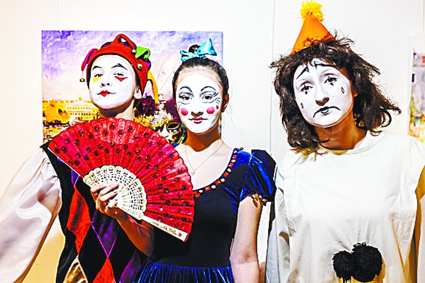 На открытие выставки пришли персонажи комедии дель арте: Арлекино, Коломбина и Пьеро.