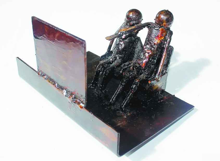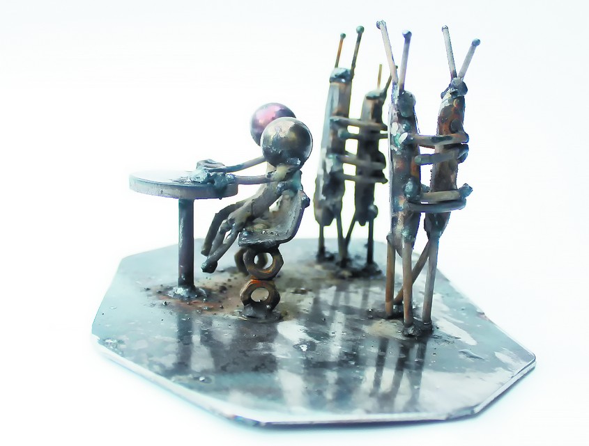 Вплотную занялся металлом Максим не так давно, а уже прошло несколько его выставок. Одна из них, как и полагается у диссидентов, — подпольная, зато персональная, где было представлено около 100 работ сварщика.