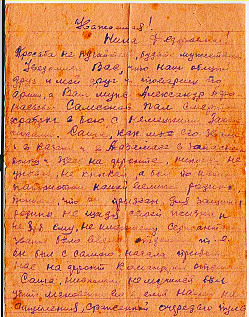 Жена Самсонова Нина Фёдоровна получила письмо от сослуживцев мужа о его гибели. Пишут, что погиб мгновенно, от пулемётной пули в грудь, не мучился.