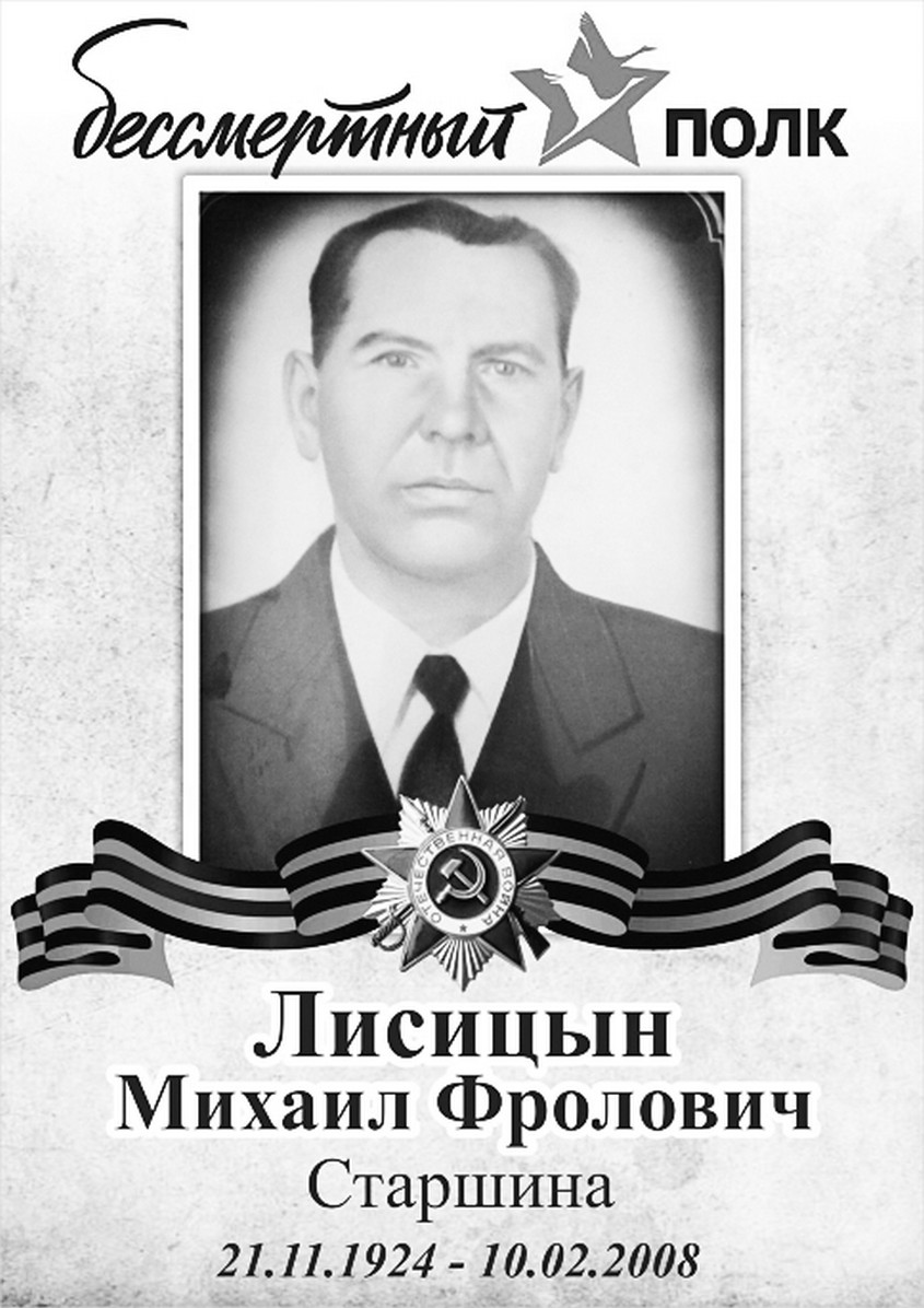 9 Мая 2018 года я вместе со своей семьёй принимала участие в шествии «Бессмертного полка». Прошла по улицам нашего города с портретом моего прадедушки — Михаила Фроловича Лисицына — с особой гордостью и глубоким почтением ко всем, кто защищал нашу Родину в годы Великой Отечественной войны.
