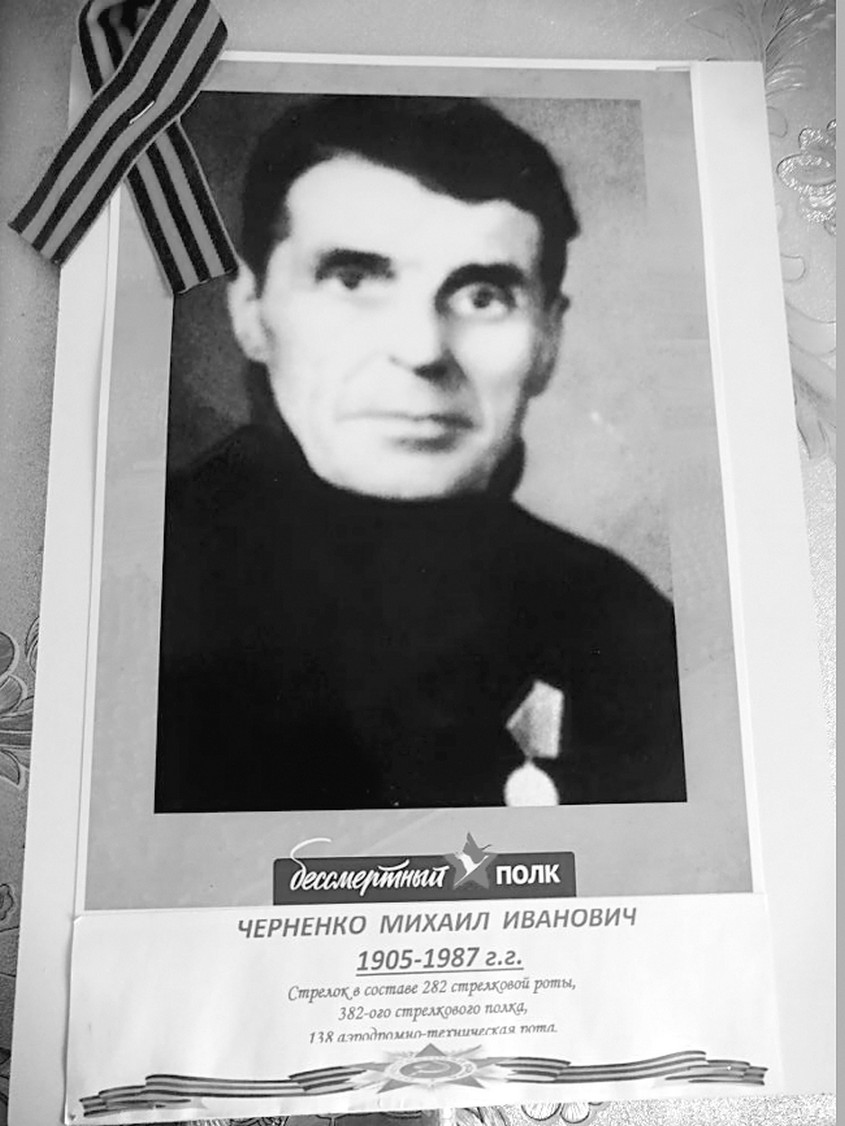 Михаил Иванович Черненко прошёл всю Великую Отечественную. Был стрелком в составе 282‑й стрелковой роты, 382-го стрелкового полка, 138-й аэродромно-технической роты. Воевал под Сталинградом. Был дважды контужен. Он также принял участие в японской войне (9 августа – 2 сентября 1945 г.). Был награждён медалями «За отвагу», «За боевые заслуги», «За победу над Японией». В войне с Японией деду сильно повредило обе ноги, и в скором времени их пришлось ампутировать. Но дед был очень сильным духом человеком и, несмотря на инвалидность, прожил долгую жизнь и умер в 1987 году.