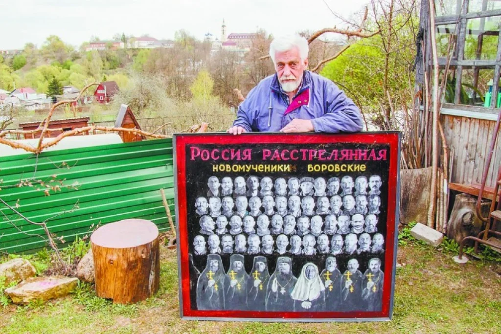— Здесь была серия картин, 8 сюжетов — «Ратные дела боровчан». Я рисовал, закрашивали, снова рисовал. Картина «Вернём имена из небытия» простояла месяца 4. Её закрасили белилами. Я написал: «Супрематический квадрат белый». Закрасили. Потом написал: «Память о национальных трагедиях так же священна, как память о победах!» Закрасили. Сделал большую вывеску: «Боровск — музей под открытым небом!» Убрали. Я считаю, что местные власти возглавляют борьбу за безликость Боровска. Сколько моих картин закрашено и уничтожено под предлогом «ожидается приезд губернатора»!..