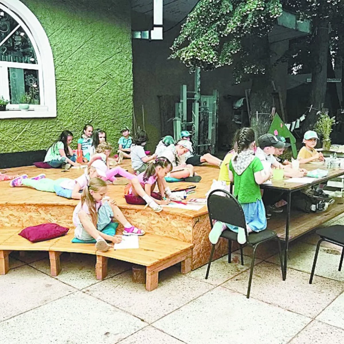 Активным благоустройством пространства вокруг экорезиденции ребята занялись ещё в начале мая. На собственные средства сделали деревянную площадку-палубу, которая закрыла разбитые ступеньки. В тёплые, солнечные дни на ней любит играть малышня. Во время праздников, которые устраивает «Зелёный центр», палуба становится маленькой сценой.
