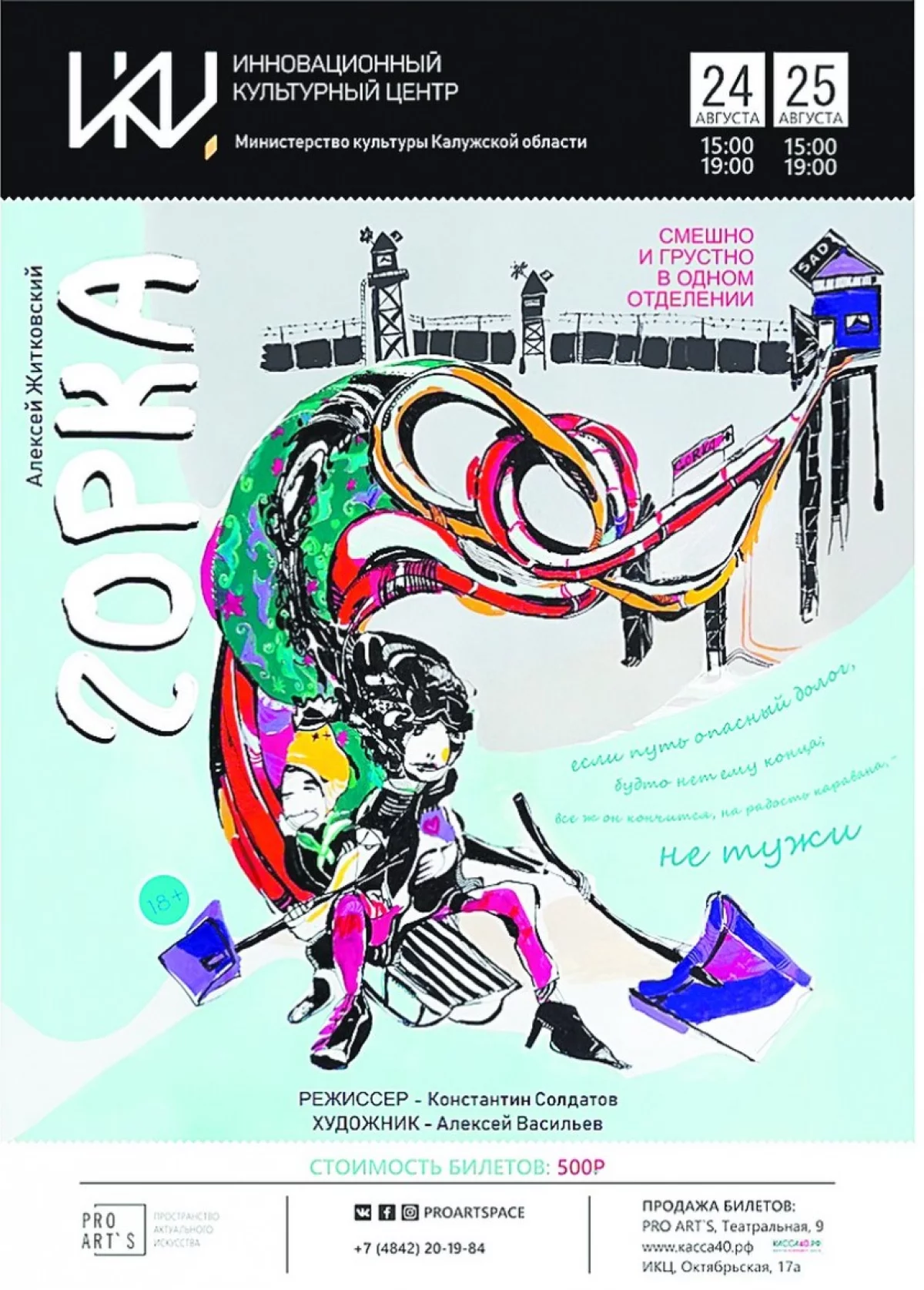 — В Pro Art’s мы используем всё доступное пространство, — объясняет режиссёр Константин СОЛДАТОВ. — Какие-то спектакли идут на втором этаже, «За белым кроликом» показывали в подвале. Есть постановки-квесты, где зритель бродит по всему зданию. Так что освоение пространства — одна из наших задач. Поэтому логично, что мы задействуем и другие площадки. Зал-трансформер ИКЦ прекрасен, несмотря на безумный паркет, который там положили.
