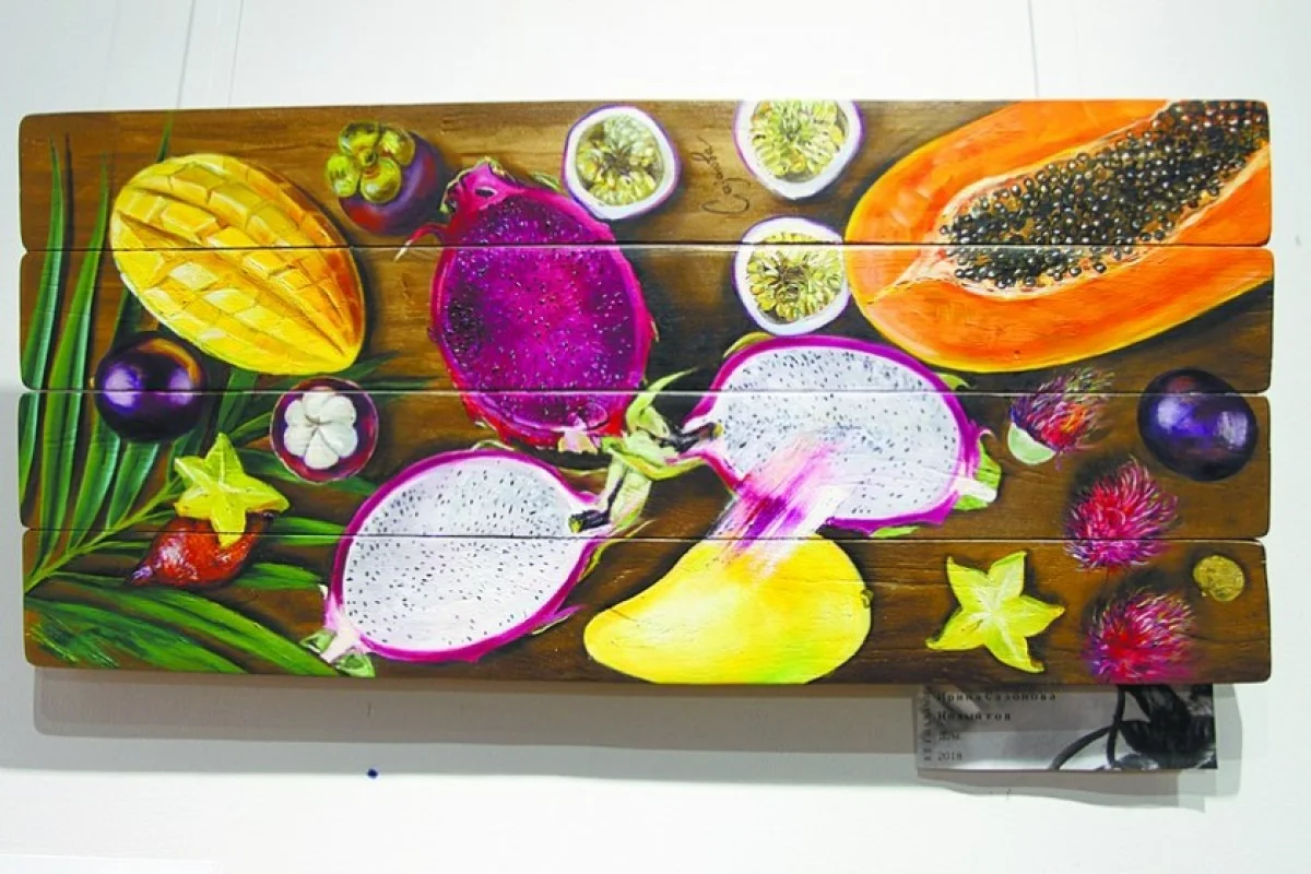 — Мне хочется, чтобы мои картины несли позитив, чтобы человек рядом с ними расслаблялся, но в то же время чтобы в них была мысль, идея, — поясняет Ирина. — Я представила на выставке два цикла — «Гурман» и «Сознание». Создавала их параллельно. Коллекция «Гурман» написана на настоящей амбарной доске. Это разобранные заборы ещё наших бабушек и дедушек. Старая древесина, потрескавшаяся… Очень интересная фактура. Я сама шлифую доски, крашу, а потом сверху наношу рисунок. В серии «Гурман» была идея показать красиво еду. На моих картинах есть и экзотические фрукты, и европейские деликатесы: пармская ветчина, сыр камамбер, которые сейчас уже не являются эксклюзивом, и мы берём их к столу, когда собираемся с друзьями. Но больше всего мне нравится, как на амбарной доске выглядят морепродукты. Хочется передать атмосферу далёких морских стран, показать лёгкость и какую-то праздность жизни.