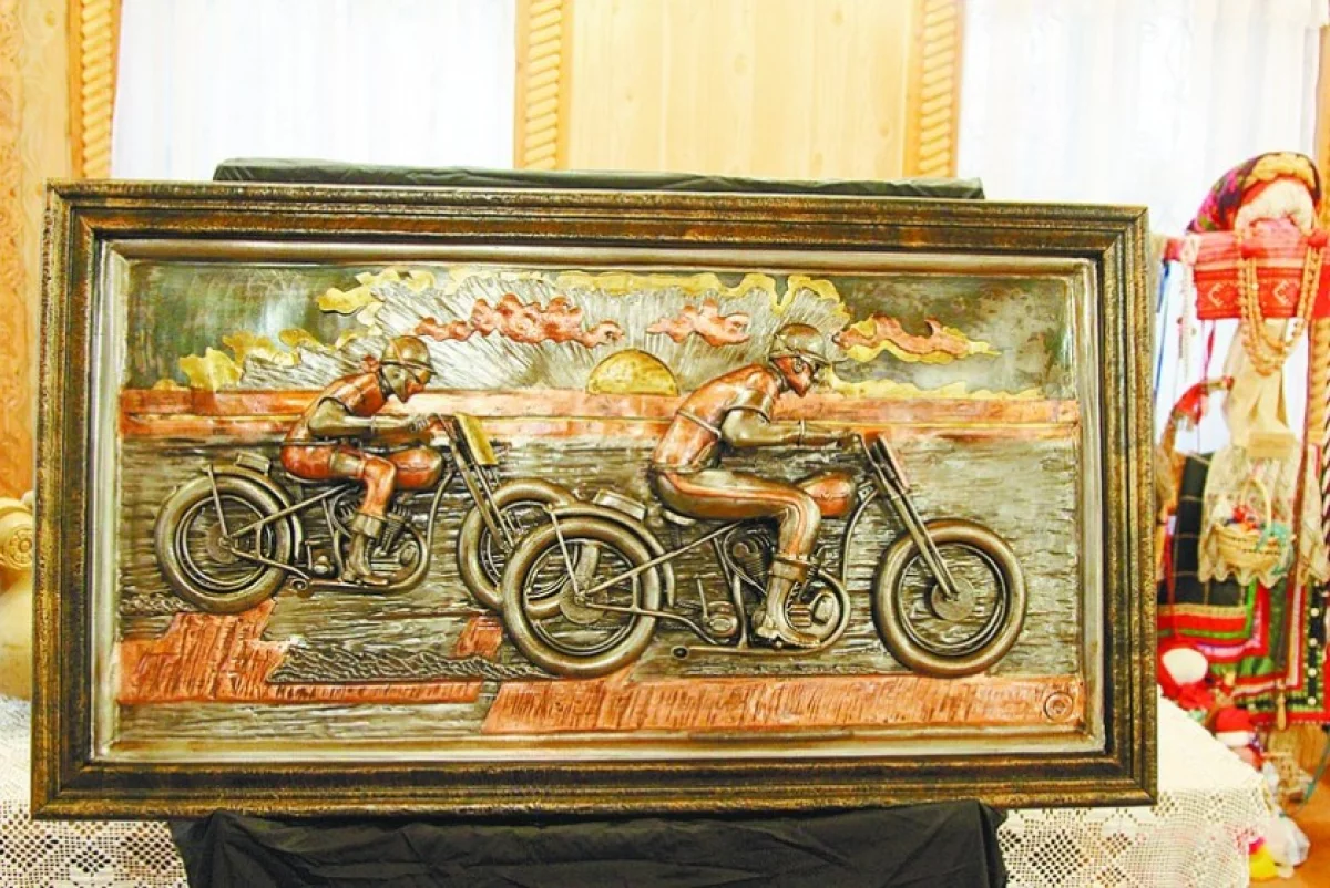 Есть и мой первый эксперимент — копия картины американского художника Тома Фрица, который создаёт полотна в мотостилистикие, показывает американскую мотожизнь. Я увидел его работы в журнале, и картина поразила меня какой-то теплотой. Загорелся воспроизвести ее, причём без краски, только металл. Использовал низкоуглеродистую сталь, латунь, медь и немного нержавейки.