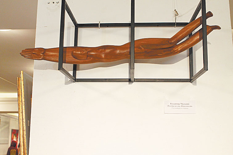 Одна из моих любимых работ — «Полёты во сне. Невесомость». На помойке нашёл полено, в середине оно было гнилое, но стенки очень толстые. И из него получилась «Невесомость»: фигурка человека — пропорции тела искажены, потому что это сон, он как бы висит в воздухе. На самом деле держится на одном штыре, которого не видно. Дерево здесь хорошо сочетается с металлом. Металл, кстати, всего несколько дней назад добавил.