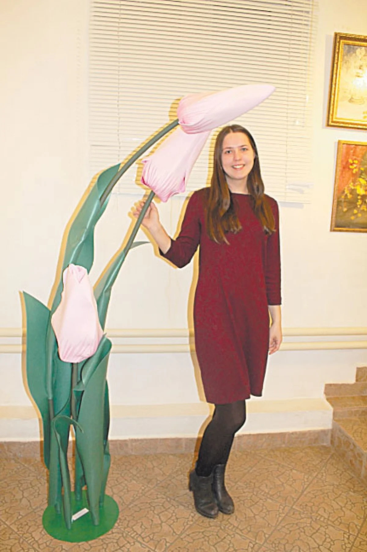 — Это ростовые цветы, — объясняет Анна. — Бутоны сделаны из фоамирана, он более нежный, его ещё называют гибкой замшей. А листья — из изолона, это более гладкий материал, создающий эффект натуральности. Цветы можно трогать, они не потеряют форму, как бы вы их ни сминали. Фоамираном я занимаюсь около трёх лет, а ростовыми цветами около года. Начинала с небольших цветочков, украшений, декора. А сейчас хочется чего-то более масштабного. Ростовые цветы красиво смотрятся в интерьере больших комнат, в праздничном оформлении, ими можно декорировать витрины. Всегда интересно добавить что-то необычное, красивое, что может вдохновлять или удивлять. Дома у меня есть вот такие же тюльпаны — мои любимые цветы.