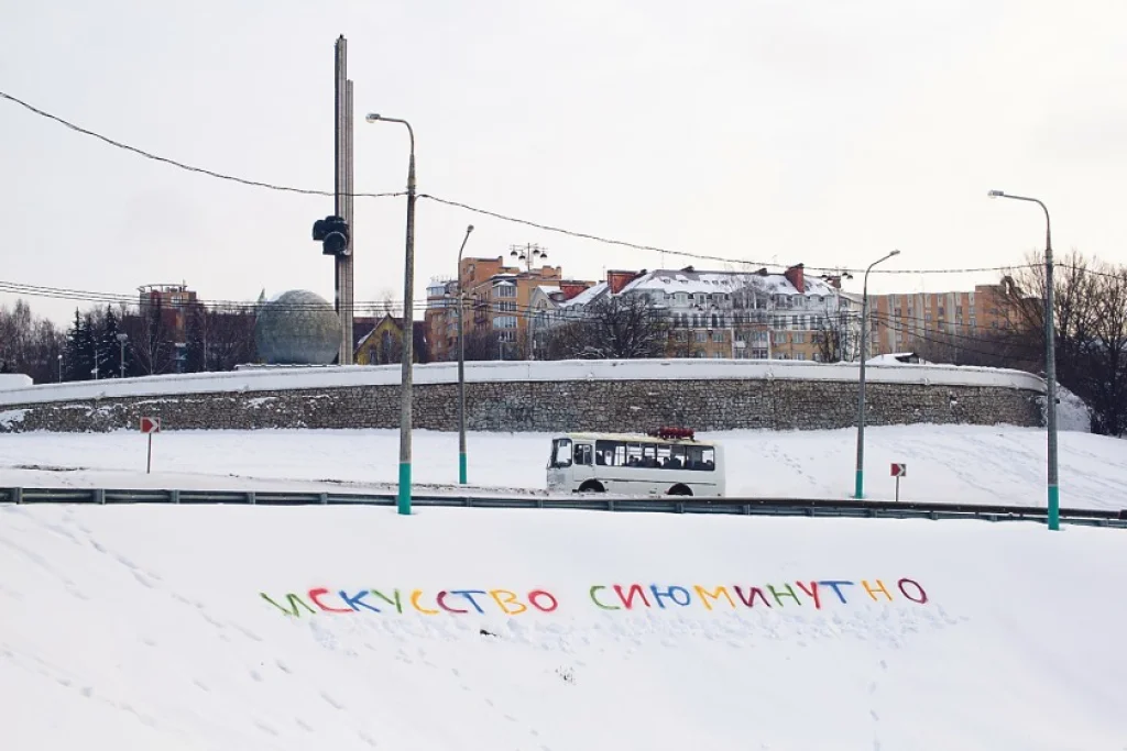 Вот и его работа — на белом снегу цветная надпись: «Искусство сиюминутно» — разлетелась по всемирной паутине.