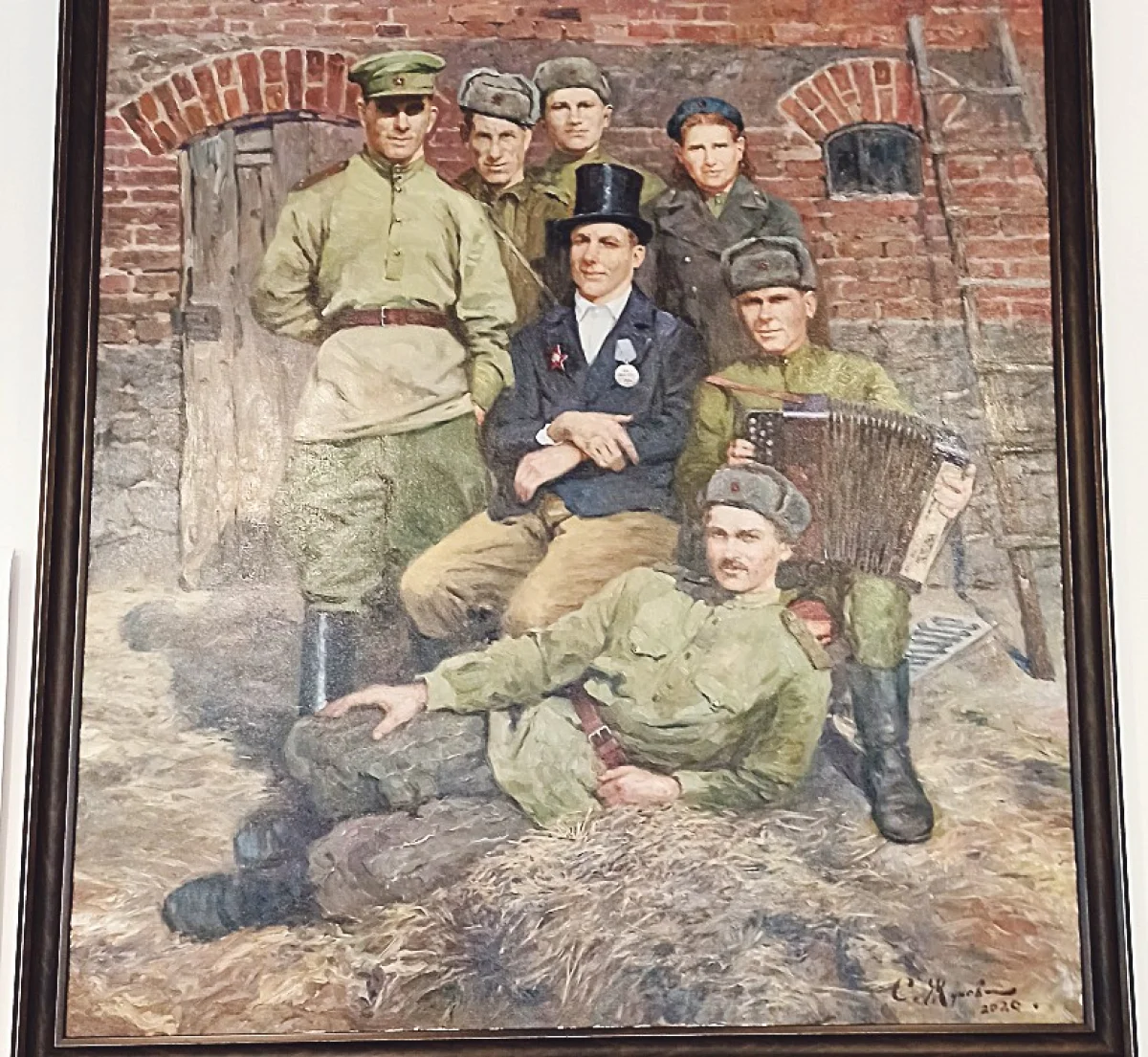 А мне к 75-летию Победы хотелось живописью передать атмосферу военных лет, показать, какими были люди. Потому что сейчас всё переписывается, искажается, и это несправедливо. Сначала я думал взять с фото только лица, изобразить героев в другой обстановке, может быть, у костра. Но потом решил: пусть будет документальное полотно. Было сложно, так как снимок маленький, не очень хорошего качества. А полотно я сделал большим. Это такая увеличенная копия военной фотографии. Все, кто на ней изображён, дошли до Берлина. На обратной стороне есть надпись: «Папаше и мамаше от Петра, в дни Великой Отечественной войны, 1945 год». В центре — солдат в трофейном пиджаке с орденами «Красной Звезды» и «За отвагу», в цилиндре. Мне показалось это знаком, неким посылом: цилиндр как символ капитализма. Становится понятно, за что и против кого сражались наши воины. За идеологические цели, социалистические. Можно заметить, как персонажи смотрят на зрителя, на современных людей, — скорее всего, с укором…