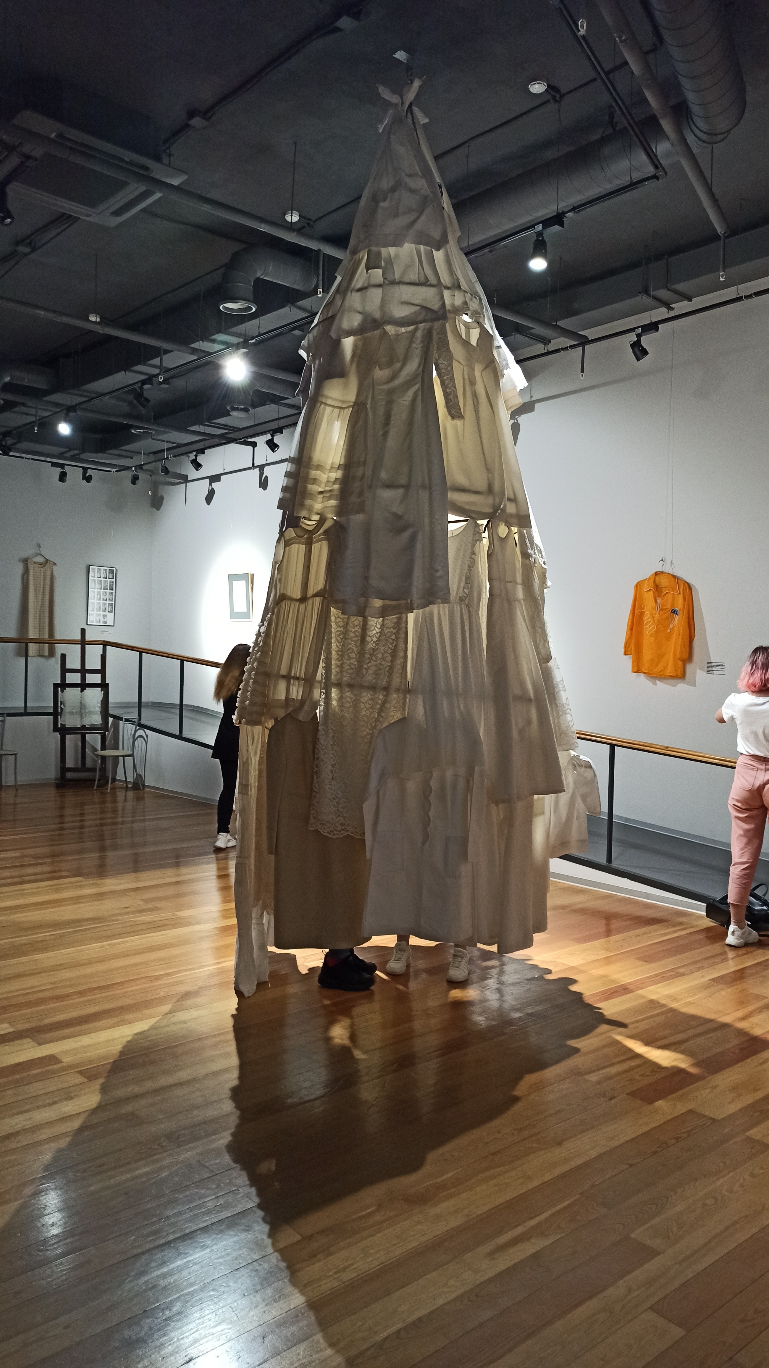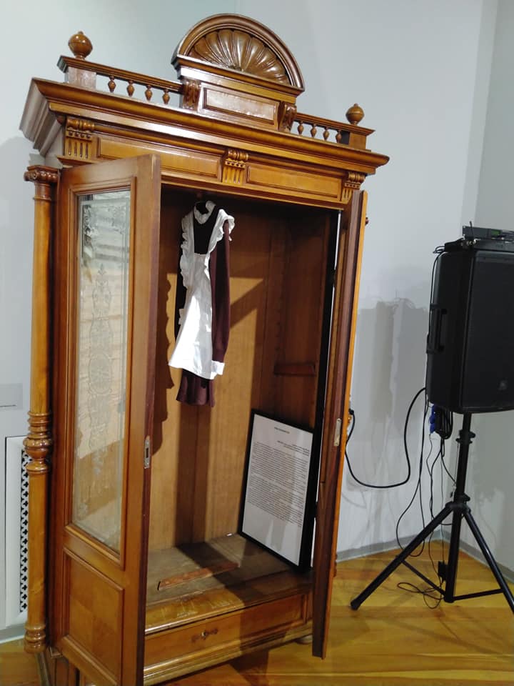 Каждая история очаровывает и трогает до глубины души. В самом нарядном шкафу висит скромная школьная форма, но это платье — совершенно необыкновенное. Его когда-то связала бабушка художницы Лизы Ольшанской. Платье, в отличие от жёсткой и колючей формы, получилось мягким и приятным. Девочка носила его несколько лет, и оно росло вместе с ней: бабушка его удлиняла, подвязывала, дошивала. В память о бабушке Мирре Лиза создала и представила на выставке арт-объект «Бесконечное платье».