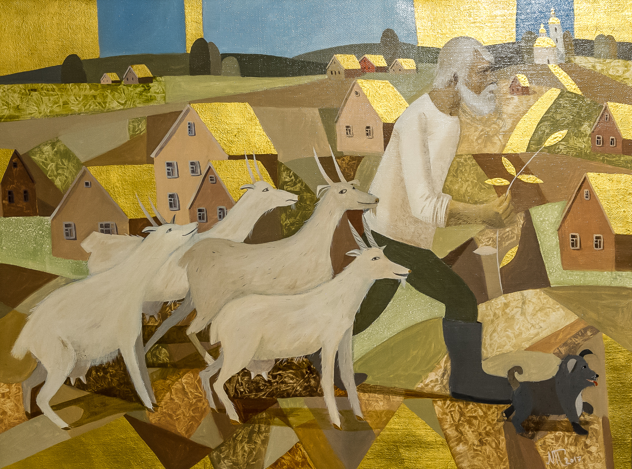 Интересует и христианская тематика. Читаю Писание и рисую, используя символы. Например, «Три лодки» — картина с евангельской темой, но, если человек об этом не знает, всё равно она заставляет размышлять, философствовать. Или полотно «Пастух». Долгое время у нас был сосед, который пас коз. И у меня есть несколько его реалистичных портретов. Здесь же много символов. Мир, как некая мозаика, расколотое зеркало. И пастух собирает стадо, чтобы привести куда-то, — мы с вами знаем, куда.