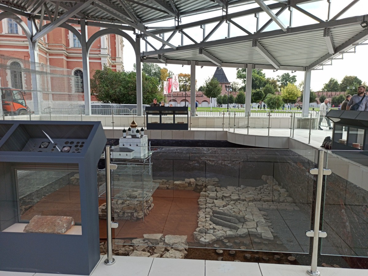 В анонсе тульского праздника мы писали о музеефикации места раскопок. Вот что получилось в итоге. Культурные слои видны очень ярко и отчетливо, а макет храма наглядно показывает каким был оригинал, стоявший на этом месте столетия назад.