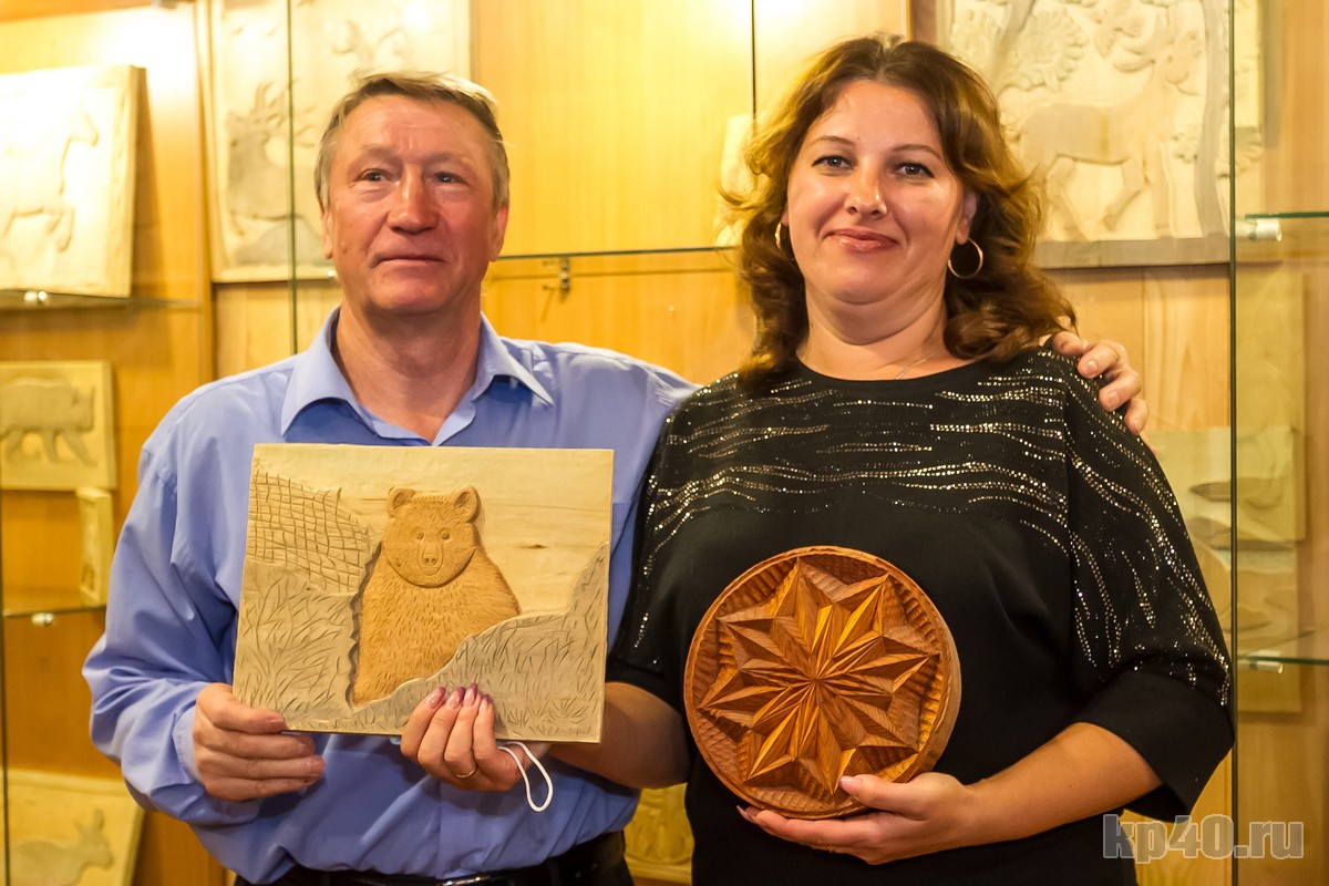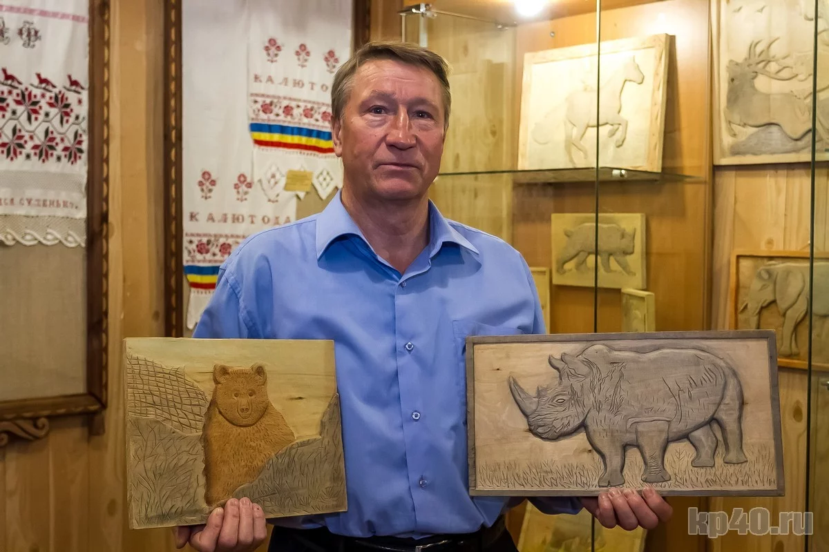 18 лет я в шахте под землей отработал, а потом пришел на завод. А кем работать? Никакой специальности нет. На станках вовремя не выучился. Пошел стропальщиком. Потом электрокар освоил. Работал на Турбинке, на Ремпутьмаше. А затем - в Доме мастеров. Я - участник коллектива «Калужская тальянка». Когда нам отдали под Дом мастеров красивое старинное здание, здесь надо было все обустраивать, ремонтировать. Работали наши калужские резчики по древу - Евгений Столяров, Валерий Скачков, Юрий Корчагин и я. Вот и сейчас принёс подарок для Дома мастеров – работу из цельного дерева.
