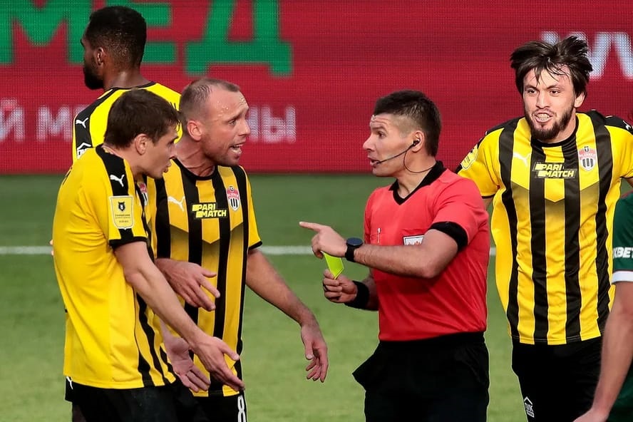Евгений Кукуляк показывает желтую карточку Денису Глушакову.