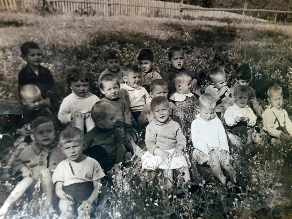 В детский садик Светлана ходила одна, он рядом с домом. Летом детей вывозили в бор, где как раз и сделано это фото. Светлана в самом дальнем ряду, где трое детей, первая слева.