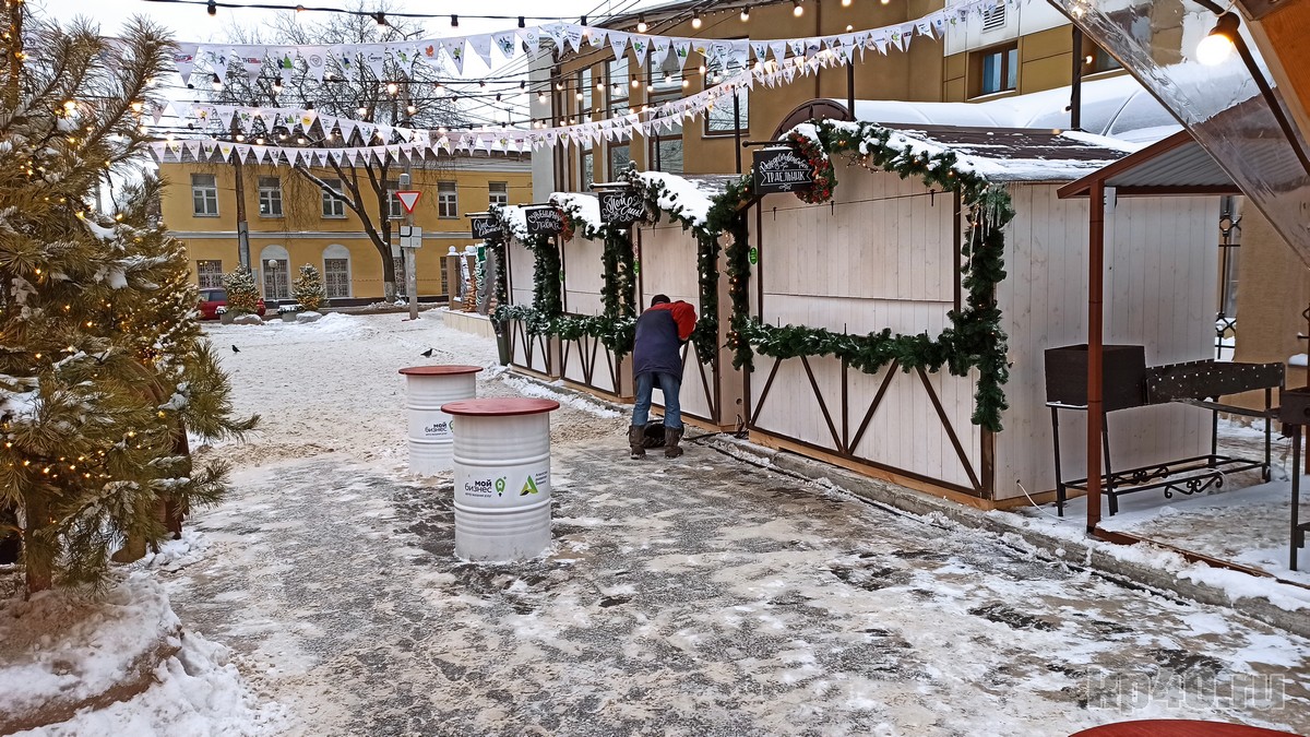 На новой пешеходной части улицы Театральной, что недалеко от сквера Ленина, в 11.00 утра пусто. Хотя программа в течение всего проекта обещает здесь «Ярмарку на Старом торге». Сама локация выглядит интересно даже без светового оформления, а вот все павильоны закрыты. Только дворник разбавлял веселую новогоднюю музыку монотонным лязганьем лопаты, которой убирал снег.