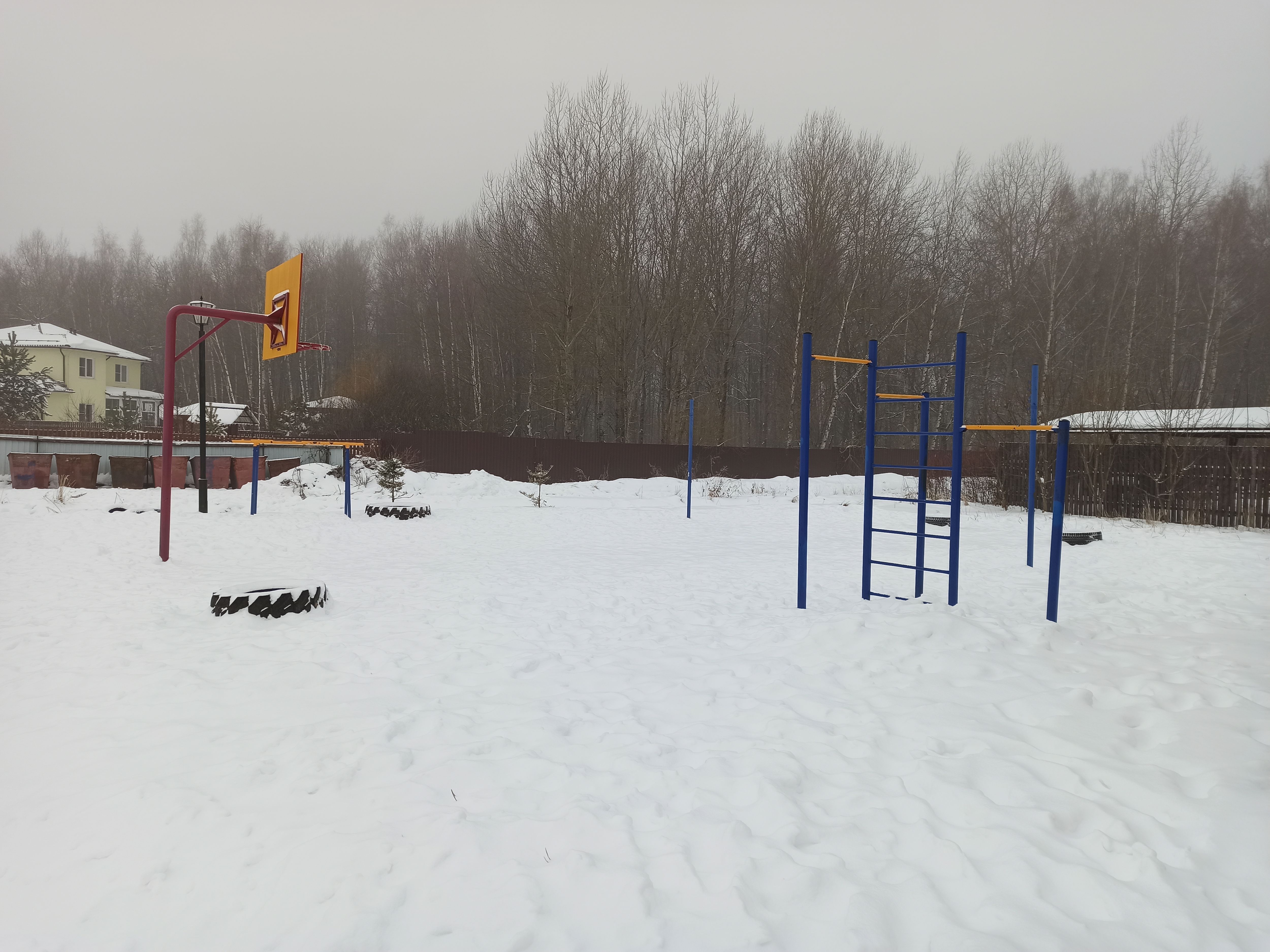 Есть место, где установлены брусья, лестница с турником, баскетбольное кольцо и столбики для волейбольной сетки. Но назвать это место спортивной площадкой язык не поворачивается – здесь нет даже ограждения, и мяч в два счета может улететь на чужой участок, попасть в окно дома или припаркованную машину.