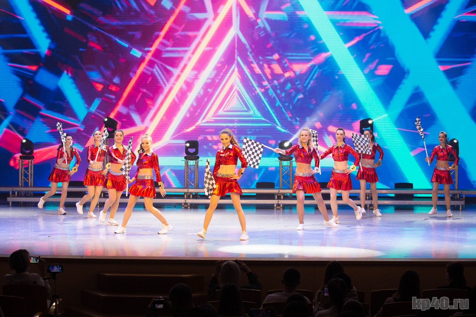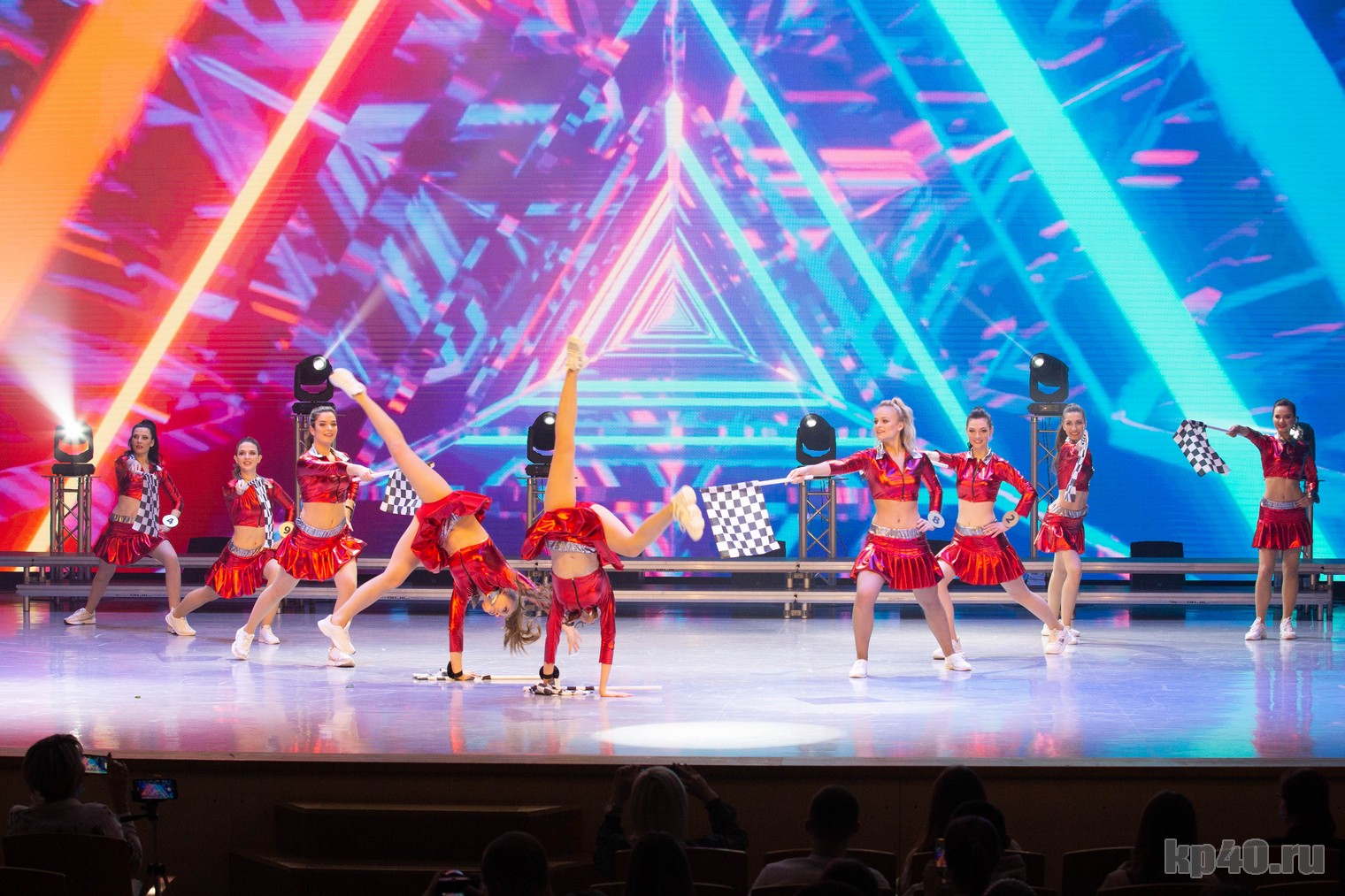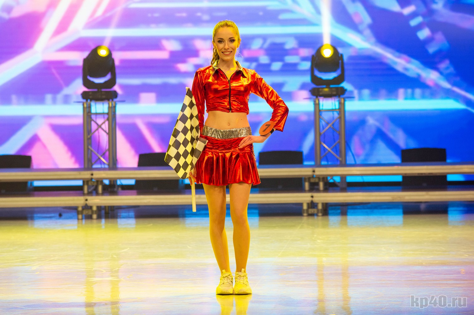 Второе дефиле тоже впечатлило мужскую половину зрителей. Девушки вышли в красных мини-юбках и с гоночными флажками, намекая на продолжение транспортной тематики после дефиле стюардесс. Во время этого показа активно использовался экран, на котором мчались спортивные машины. Все происходящее на сцене напоминало жаркие кадры из фильма «Форсаж».