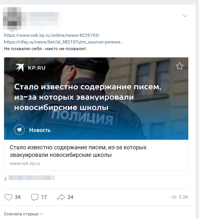«Не похвалю себя, никто не похвалит» - пишет один из ее участников и кидает ссылку на минирование школы в Новосибирске в марте.