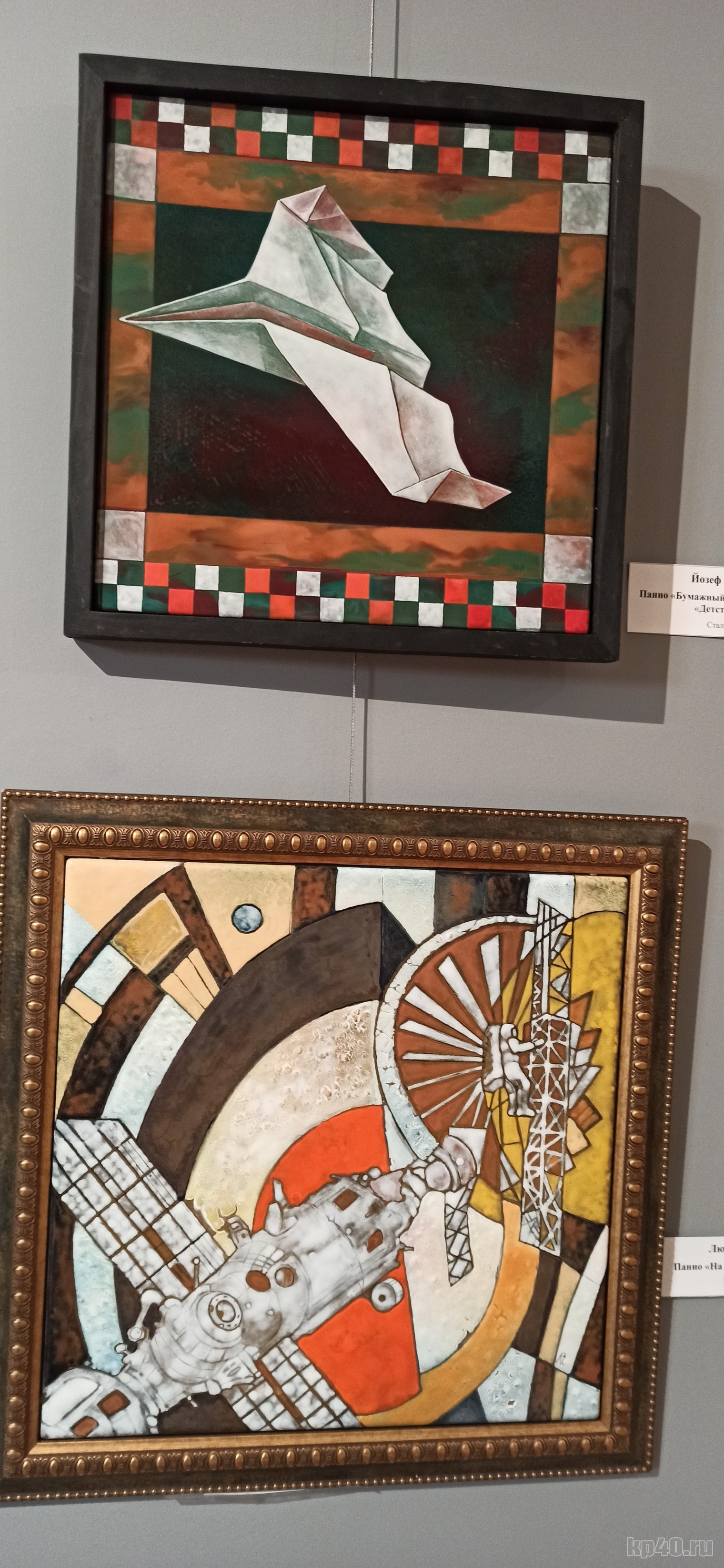 Вверху панно Йозефа Хазеньола «бумажный самолётик». Внизу – панно Людмилы зайчиковой «На околоземной орбите».