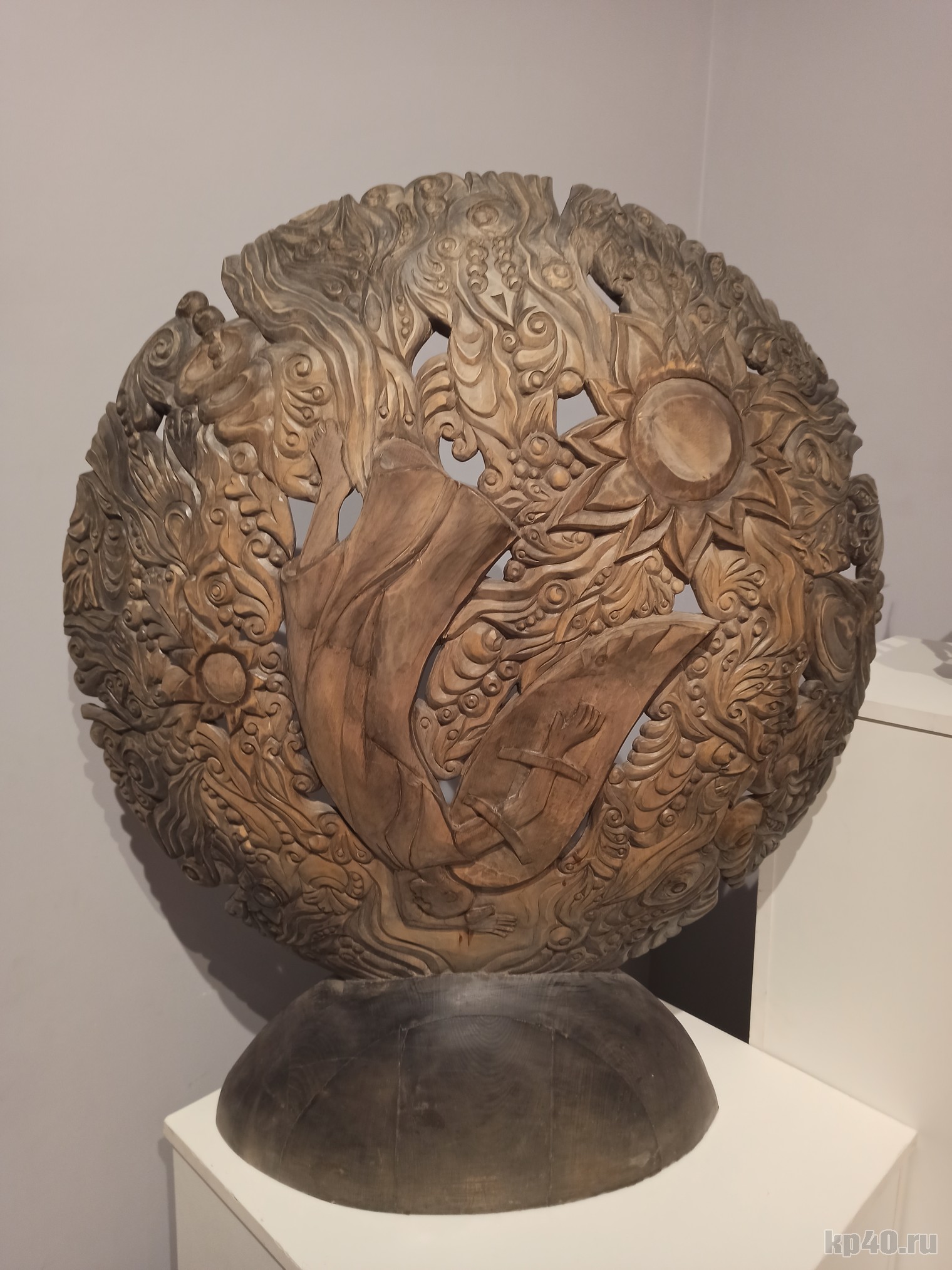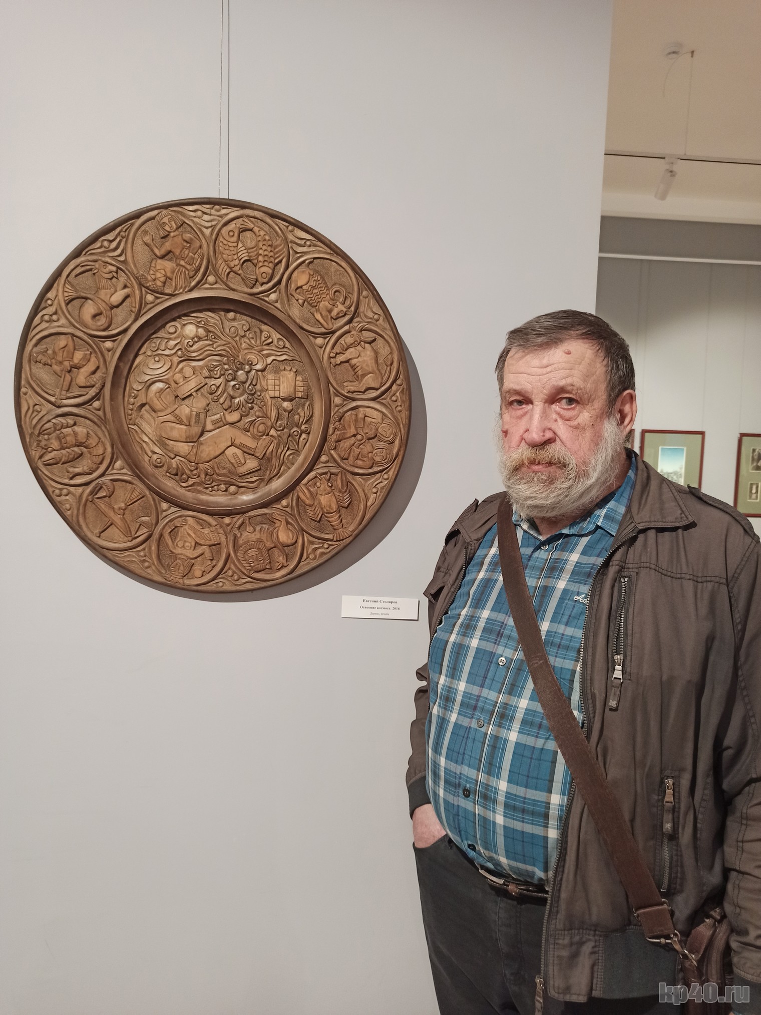 Со второй представленной здесь работой «Освоение космоса» связана интересная история. Однажды я полез в свой архив и нашёл нарисованный углём эскиз на космическую тему. Он был сделан ещё во время моей учёбы. Я подумал, что всё новое — это хорошо забытое старое. И получилась композиция «Освоение космоса». По кругу — знаки Зодиака, а в центральной части — космонавт с кинокамерой. Он смотрит в пространство. Кинокамеру, которую он держит, нельзя было сделать иной, потому что она должна иметь вес. Таких камер в космосе, конечно, быть не может. Рядом космическая станция летает. Вообще на тему космоса работать тяжело в смысле выбора сюжета. Космической темы в дереве мало. Да и вообще дерева на выставках мало, хотя мы живём в такой стране, где оно должно быть главным материалом. Но, к сожалению, где-то его считают уже анахронизмом. А я дерево люблю, чувствую его. Сейчас работаю в основном с липой, но раньше работал с разными породами, в том числе и с красным деревом. В дереве сложней всего сохранить цельность композиции. И всегда сложно заканчивать работу.