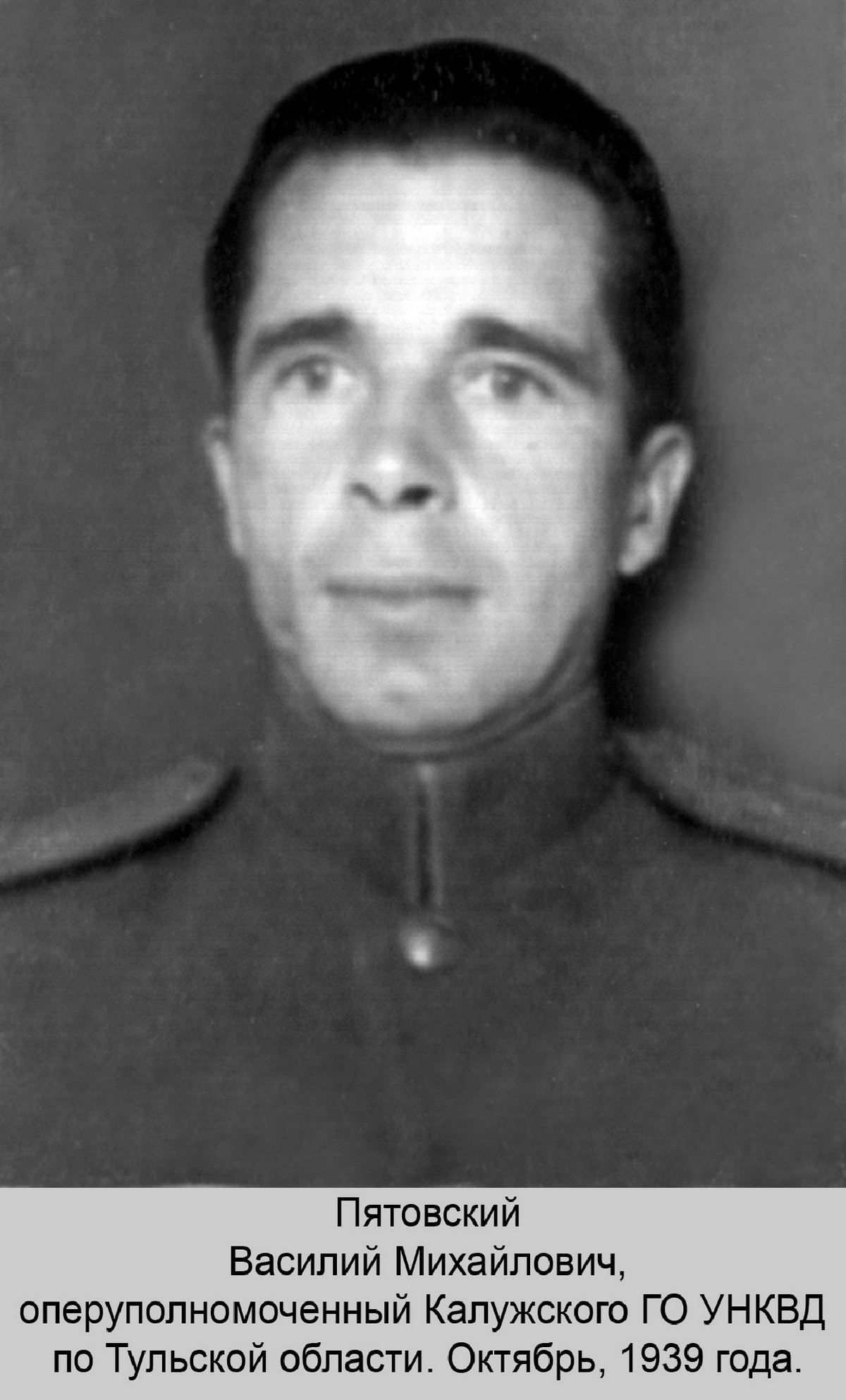 Когда мы приехали в Калугу, в городе кое-где пылали пожары. Из сотрудников горотдела НКВД помню начальника Николая Андреевича Хонина, зам. начальника отделения тов. Николая Николаевича Ильина, оперуполномоченного Василия Михайловича Пятовского, секретаря Позднякова, машинистку Глафиру Ивановну Русакову.