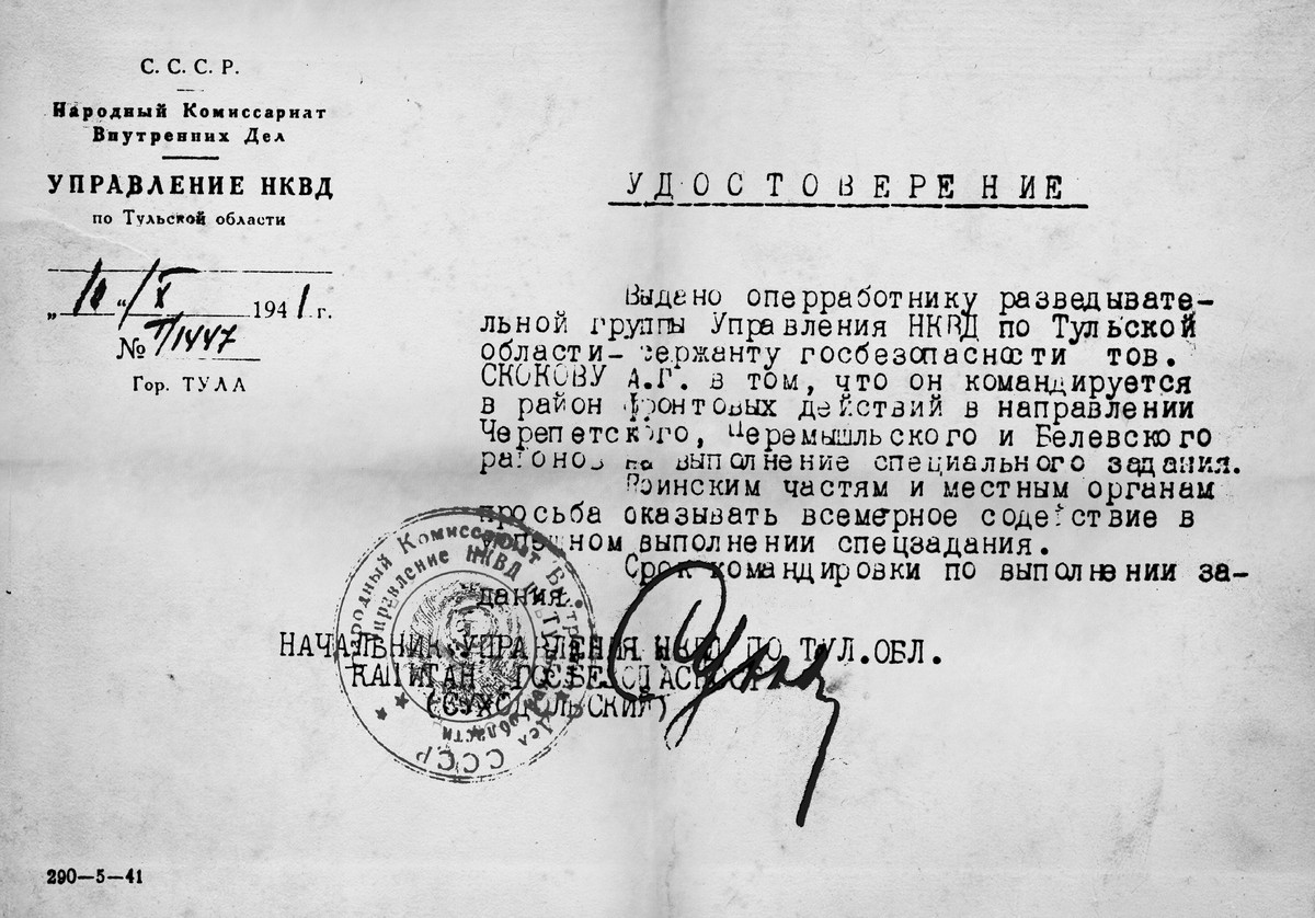 С декабря 1941 по сентябрь 1943 года Александр Скоков был начальником оперативного отделения Калужского городского отдела НКВД.
