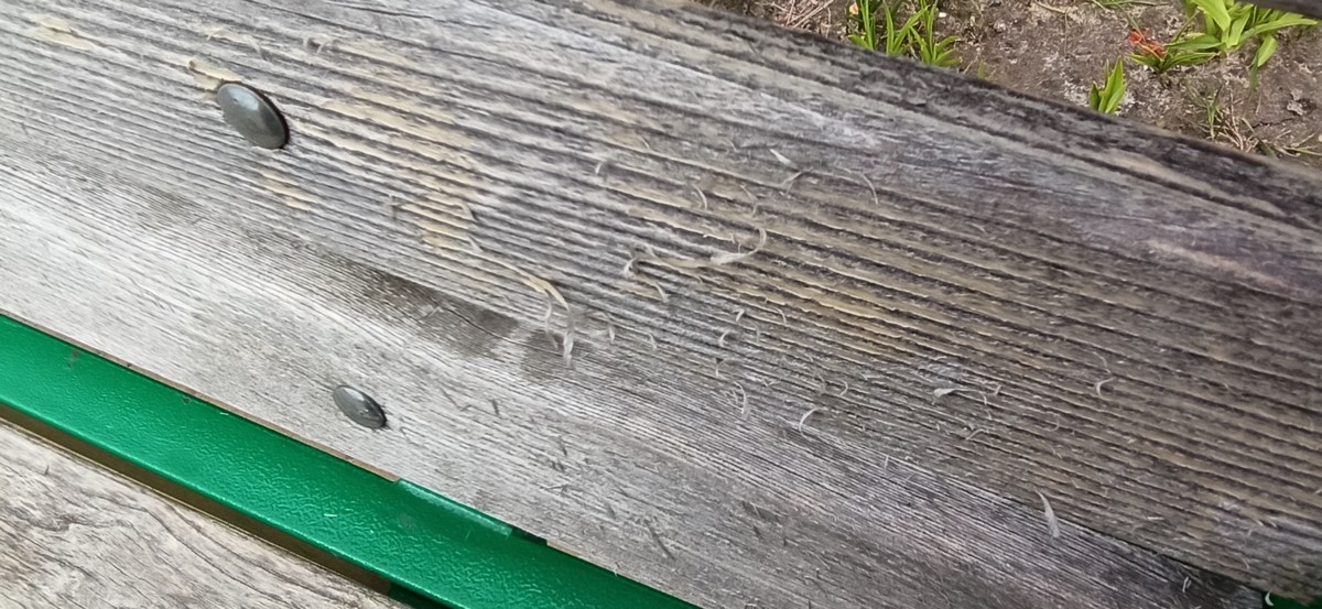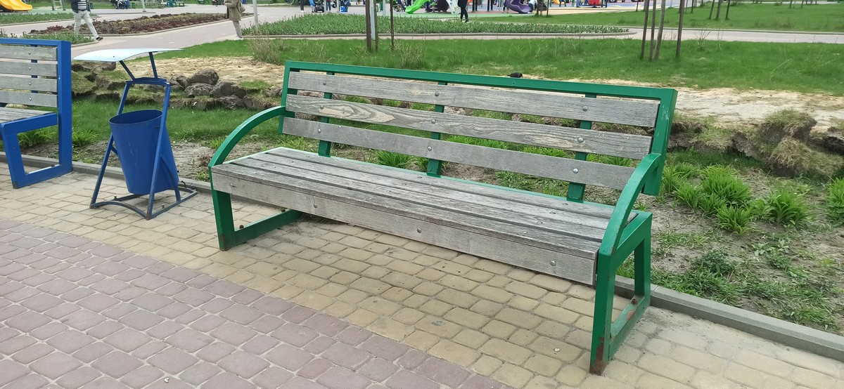 На лавочки без слез не взглянешь. От лака не осталось и следа, дерево из-за отсутствия должной обработки посерело.