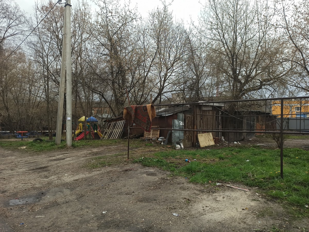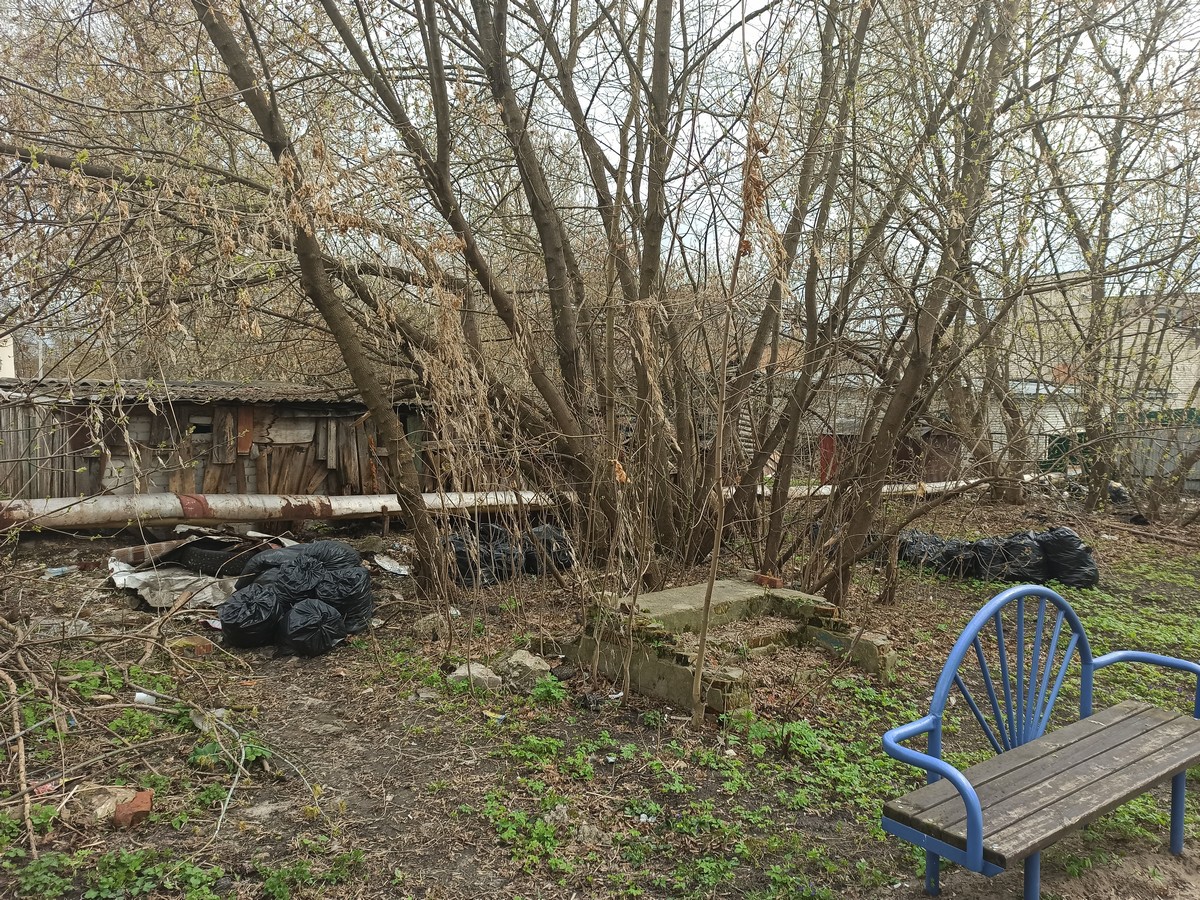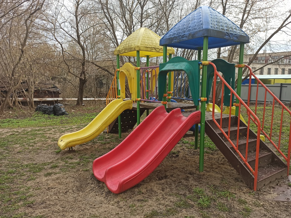В одном из дворов детская площадка утопает в бытовом мусоре и пакетах с сухой листвой. Субботники прошли, а мусор остался...