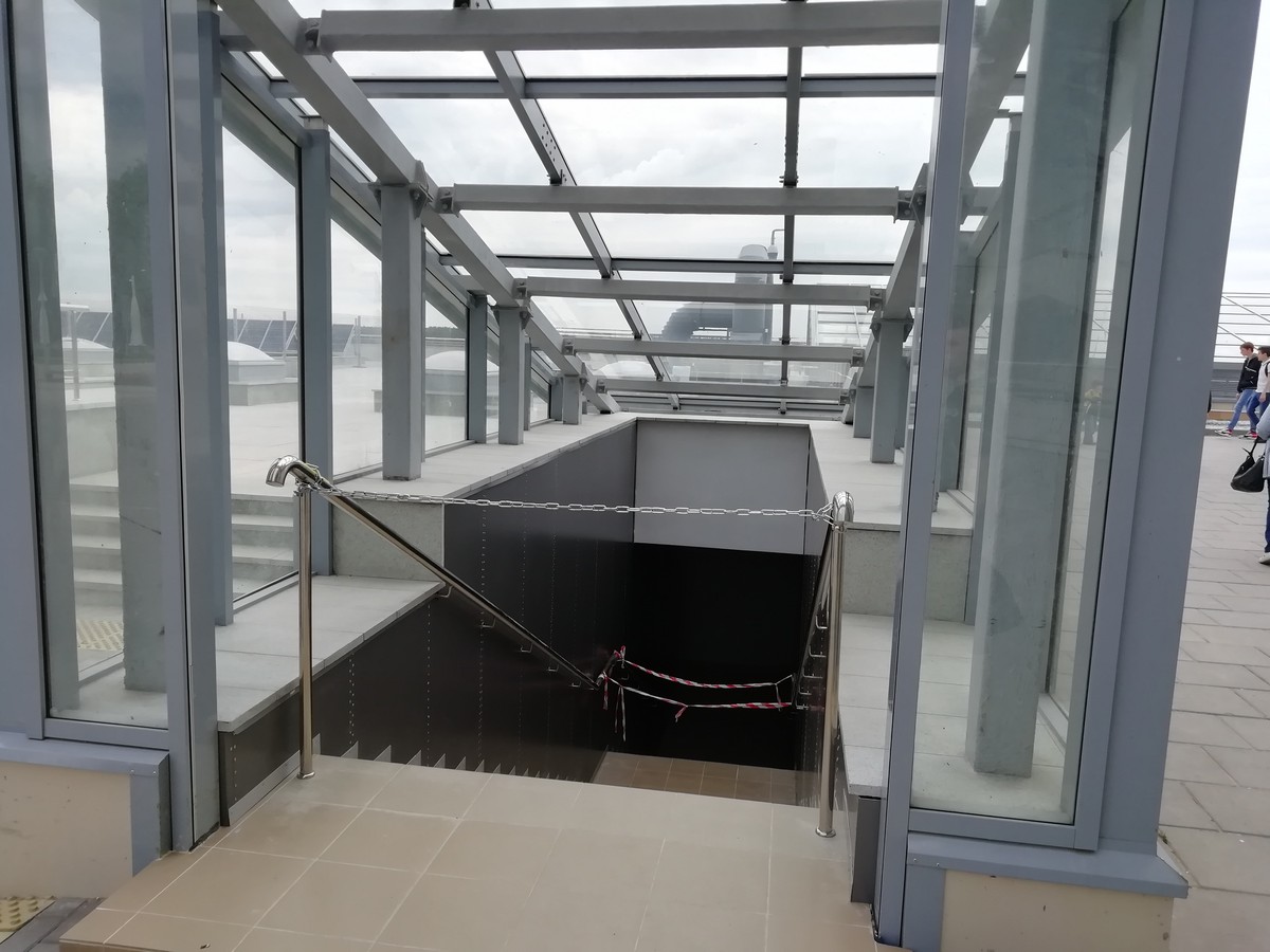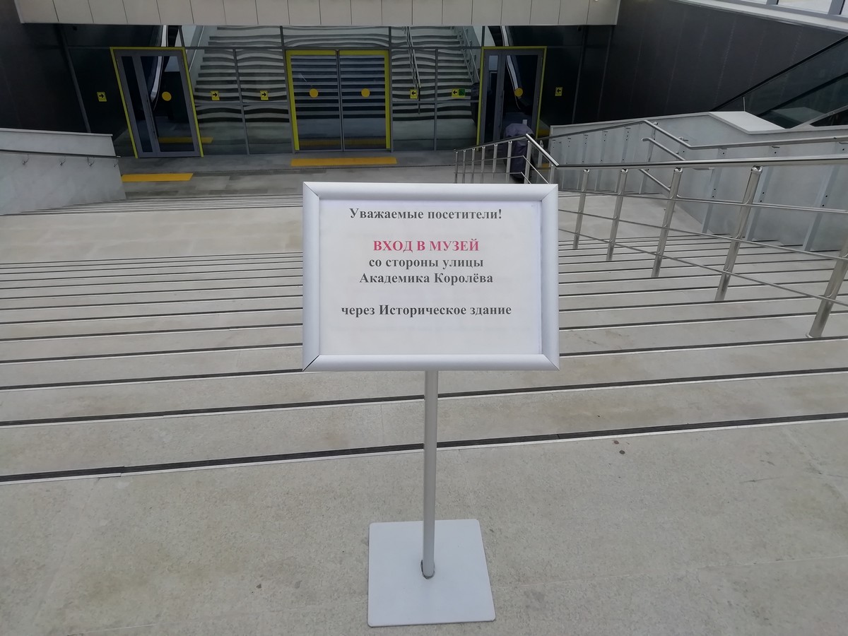 Музей пока что работает не на полную мощность. Так, например, в сквере уже намечен еще один вход, но на табличке перед ним посетителей просят обойти с другой стороны и войти привычным способом через здание на улице Академика Королева.