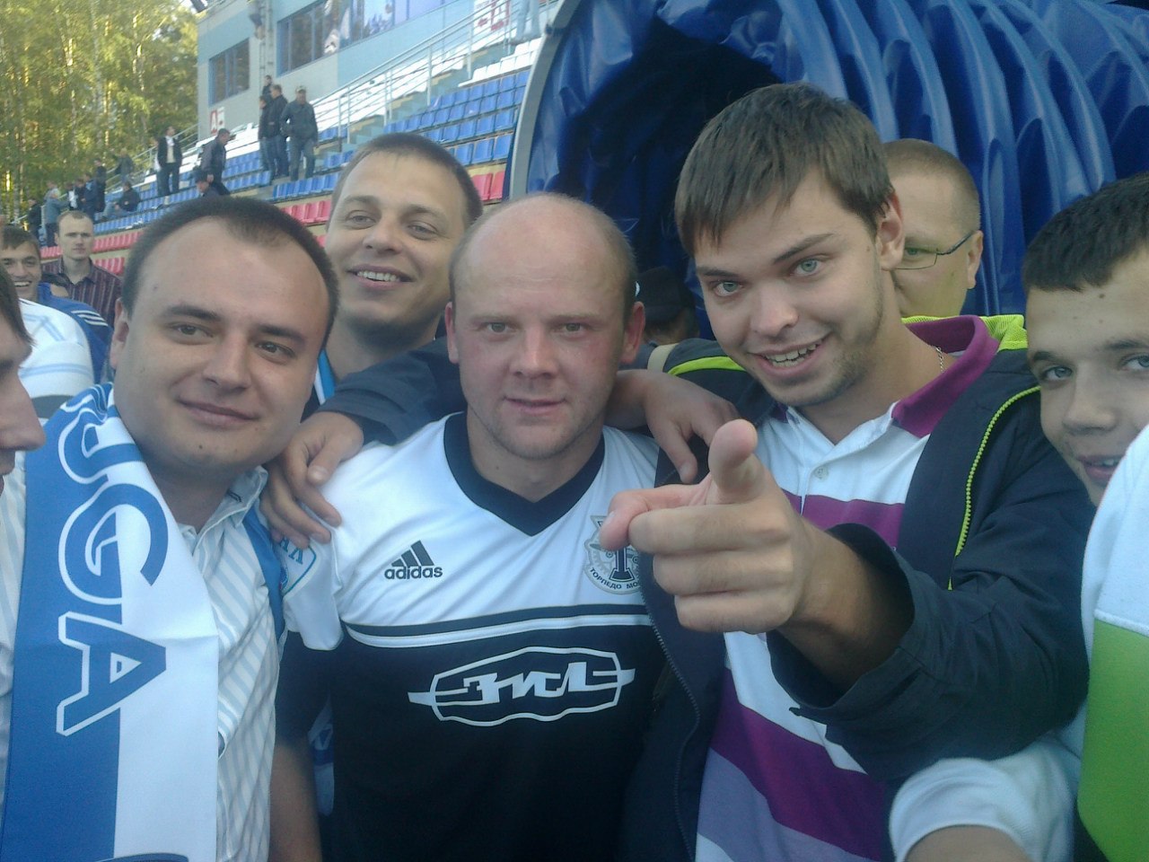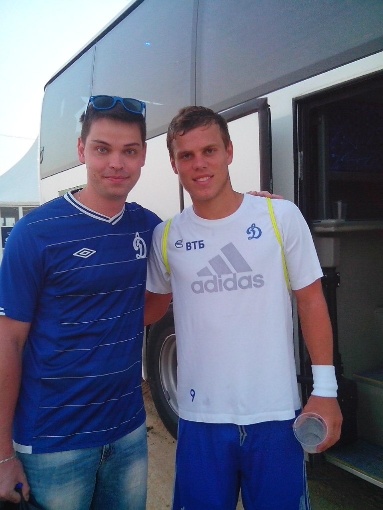 Сделал несколько фотографий с известными игроками и тренерами. Также передал флаг Александру Кокорину, который в автобусе дал расписаться на нем футболистам.