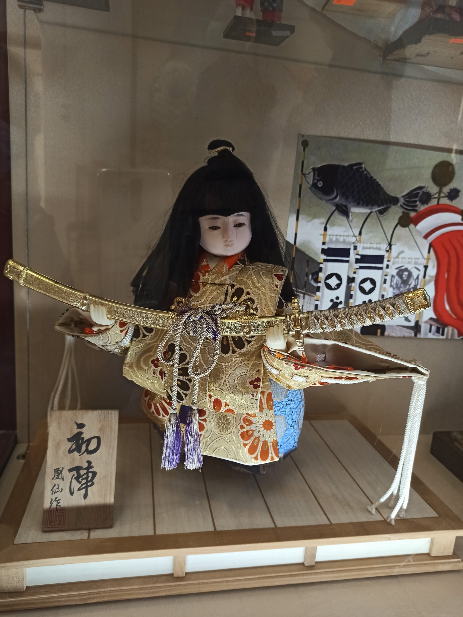5 мая в Праздник мальчиков (Танго-но сэкку) тоже устанавливали лестницу, но уже с зелёным сукном. Вверху доспехи самурев, кольчуги, большой барабан тайко и боевой веер гунбай, с помощью которого военачальники управляли своими воинами, отдавали приказы. А если веер был металлическим, то им могли защищаться в бою. Вверху — сёгун (знатный человек, военачальник), затем слуги, самураи, мальчики, мифические герои, которые сражались с демонами.