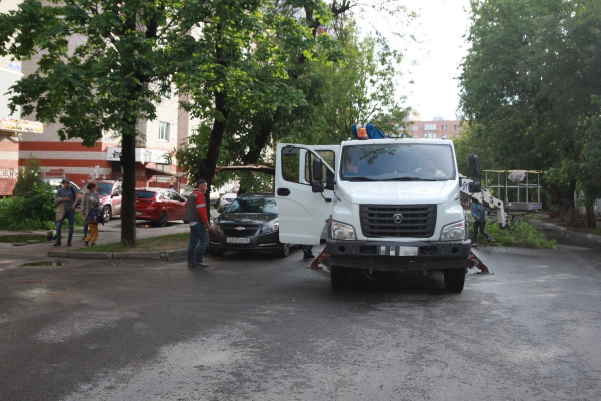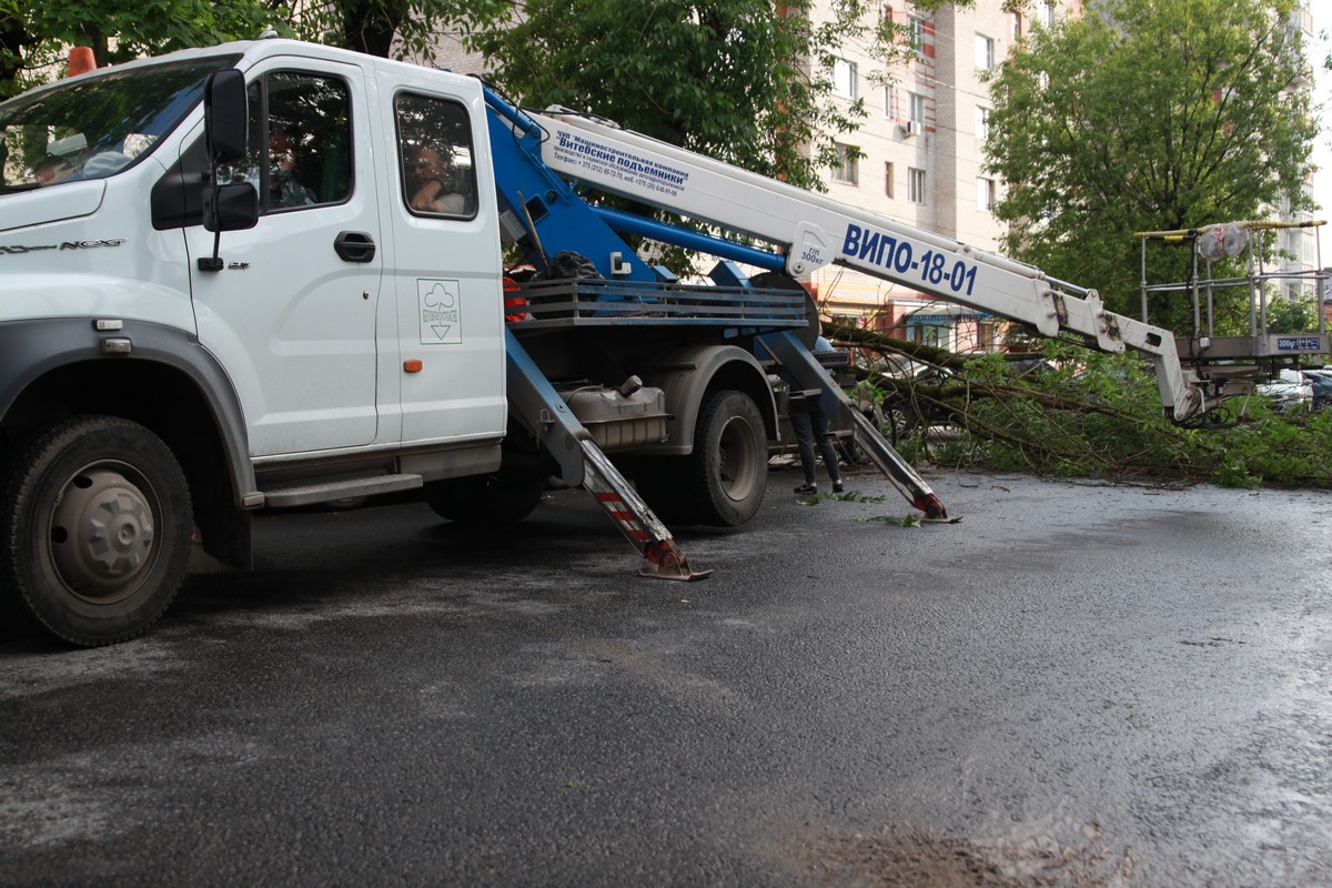 На место происшествия приехал подъемник, чтобы ликвидировать последствия грозы.