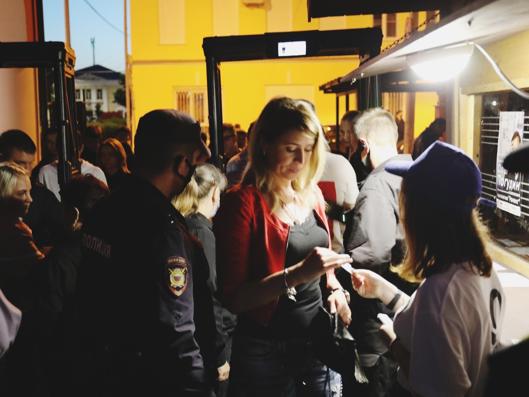 На входе стражи порядка проверяли сумки, обнюхивали емкости с водой и не пускали пьяных на территорию Гостиного двора. Также выдавали какое-то подобие билета.
