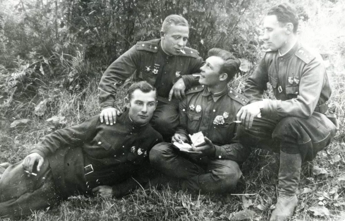 Степан Барановский, Петр Коломин, Юрий Горохов, Василий Афонин. Аэродром Железинки, 1943 год. Фото: заволжский городской художественно-краеведческий музей.