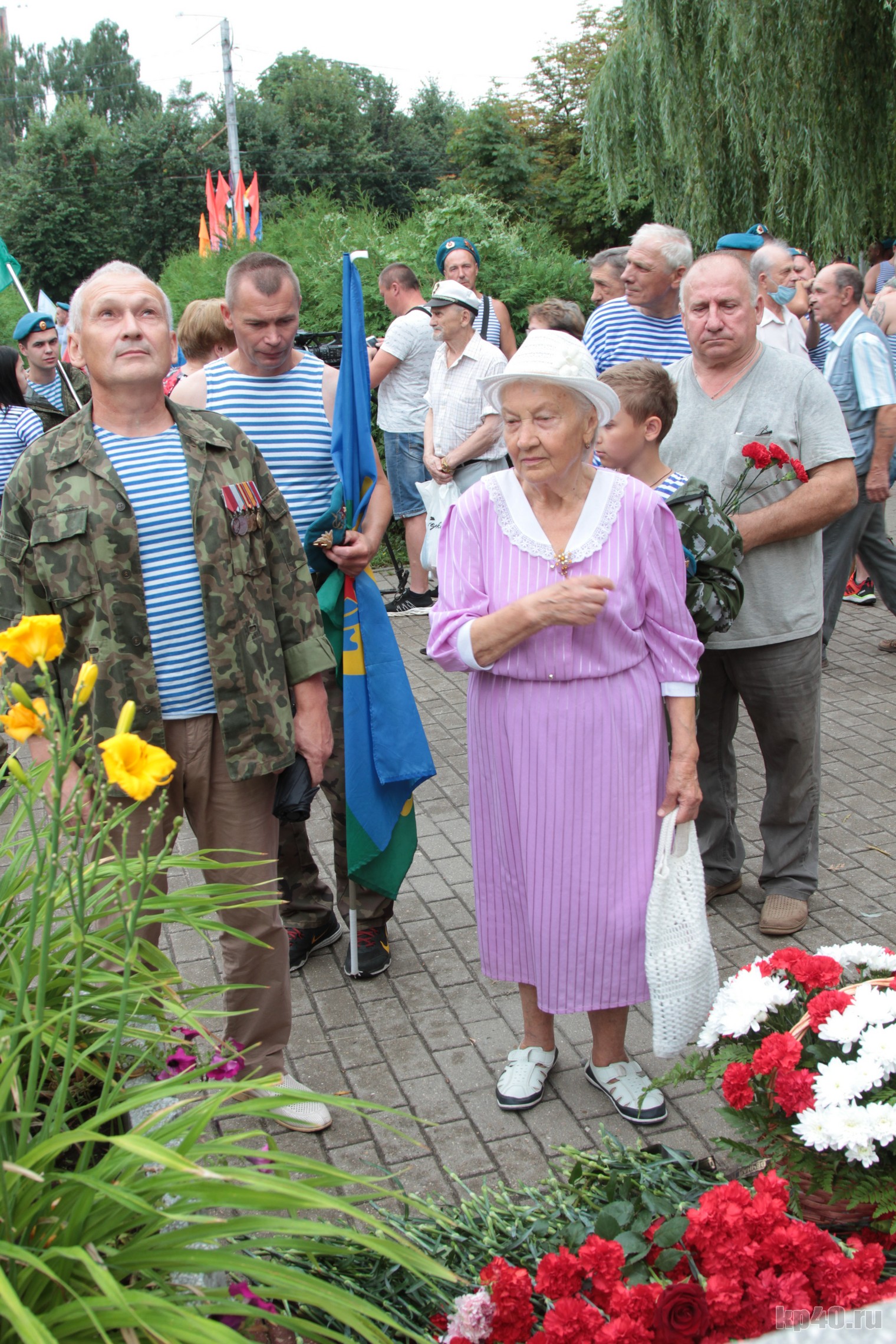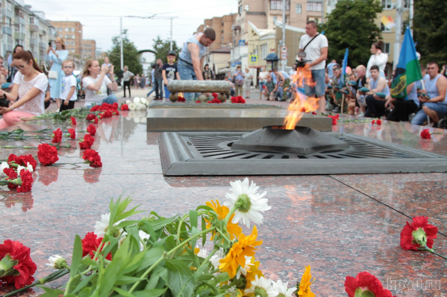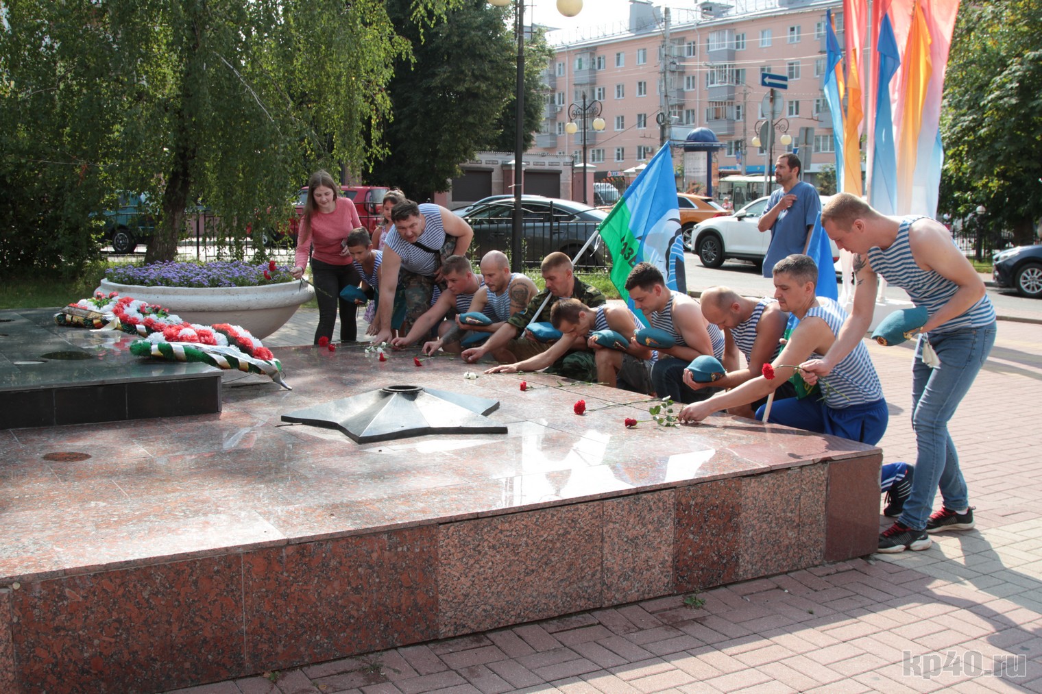 Далее десантники прошествовали на площадь Победы. Уже там состоялись небольшой митинг и возложение цветов к Вечному огню и памятнику погибшим афганцам.
