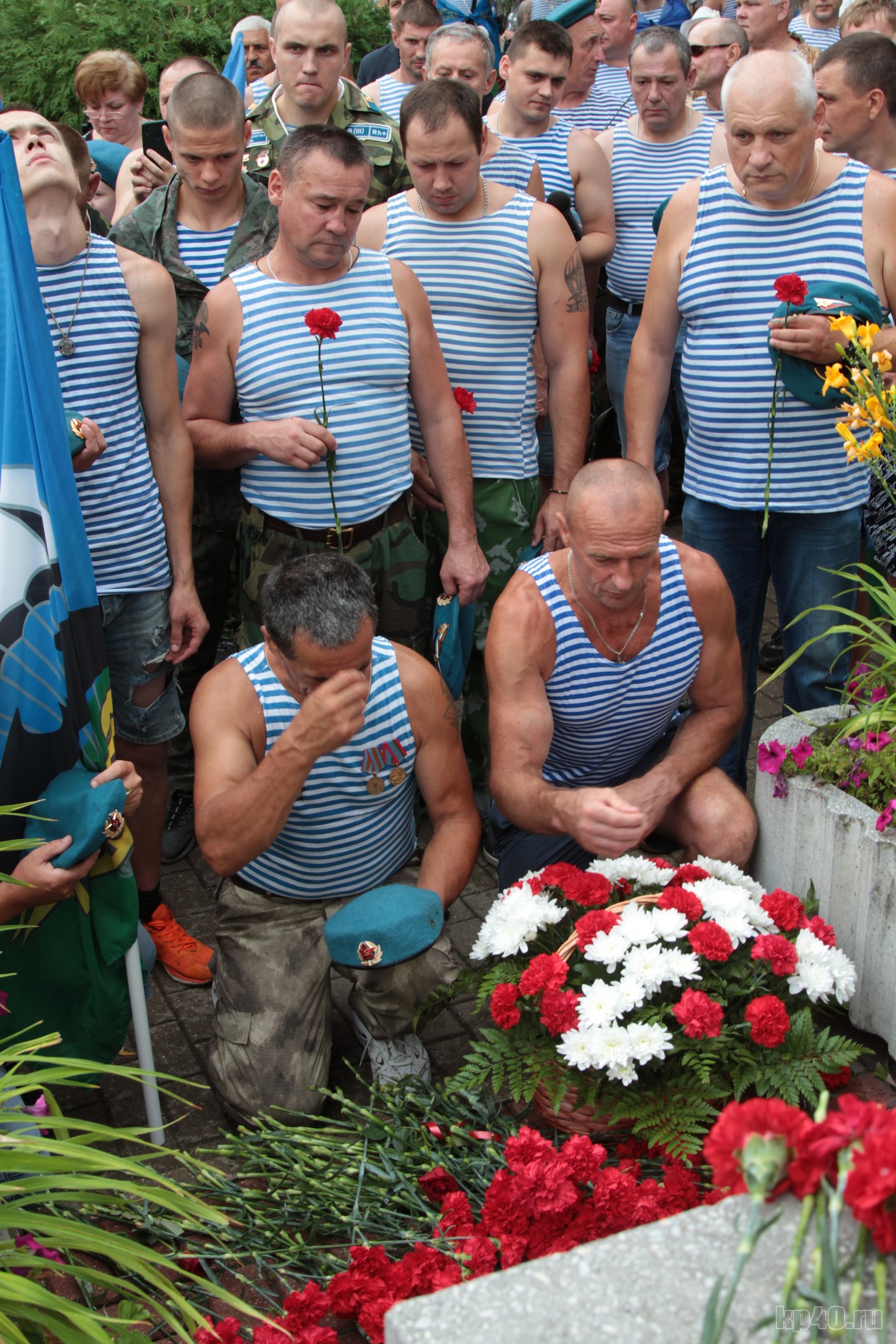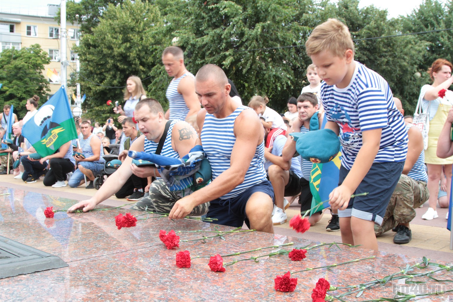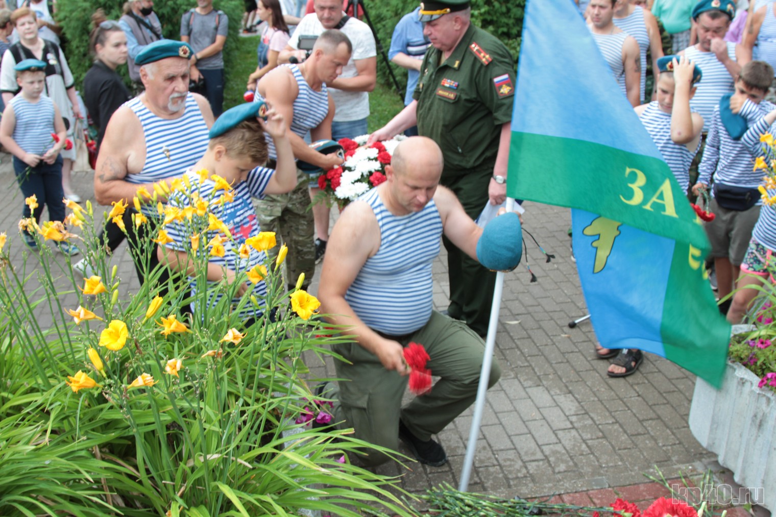 Далее десантники прошествовали на площадь Победы. Уже там состоялись небольшой митинг и возложение цветов к Вечному огню и памятнику погибшим афганцам.