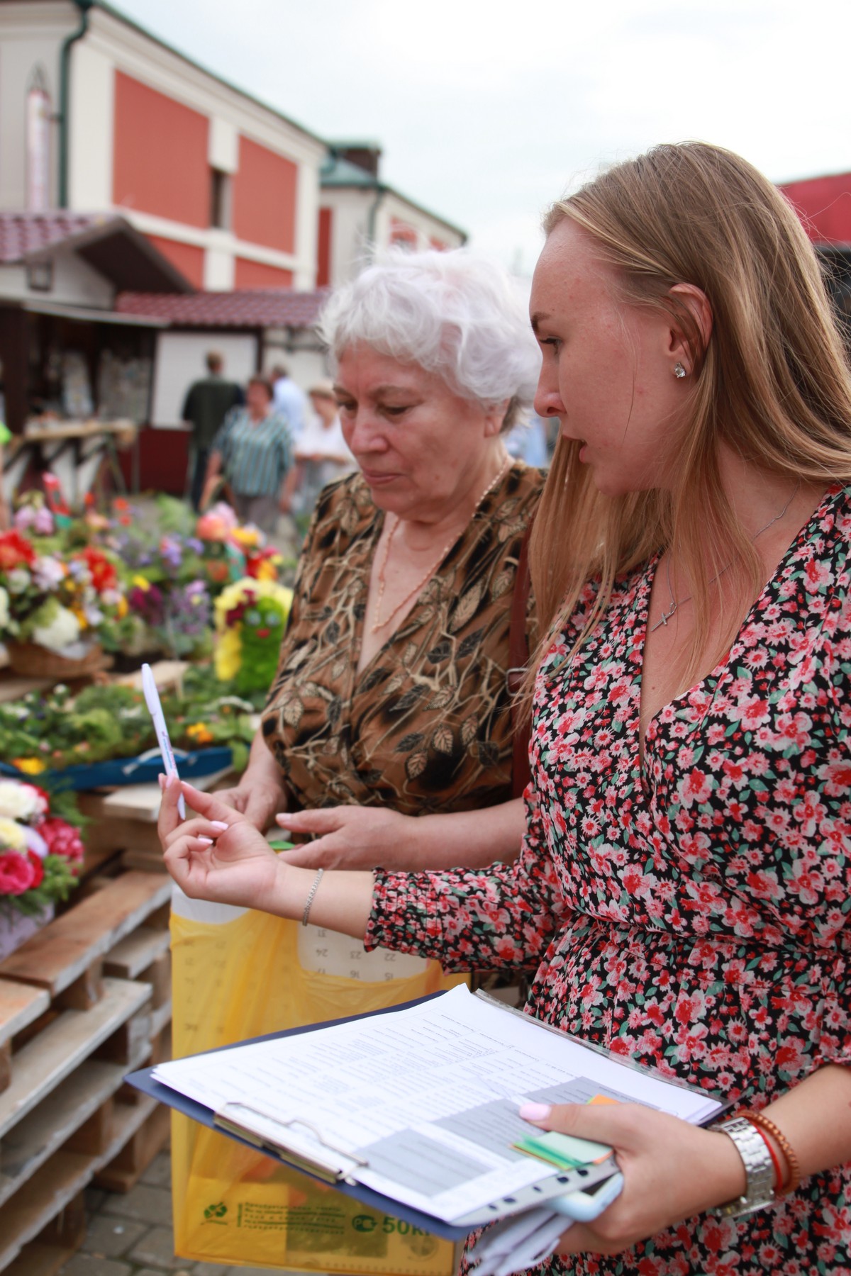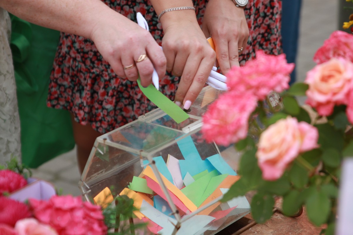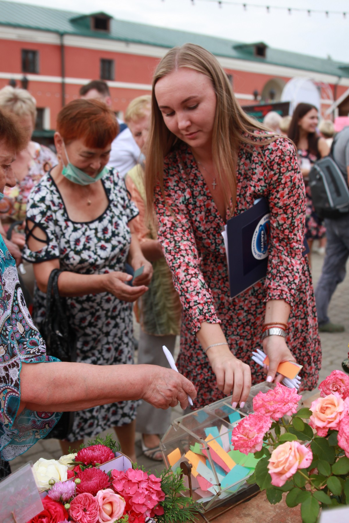 Калужане получали листочки и ручки для голосования за лучшие цветочные композиции.