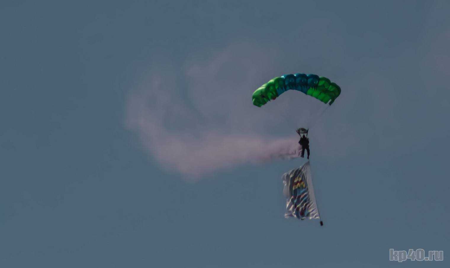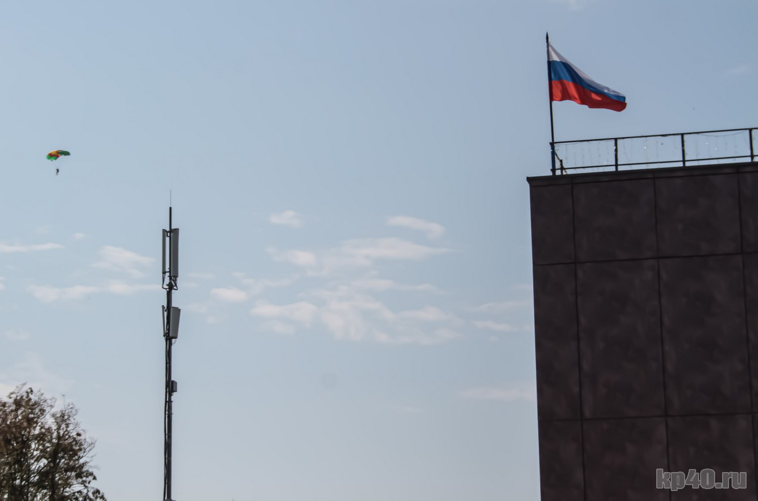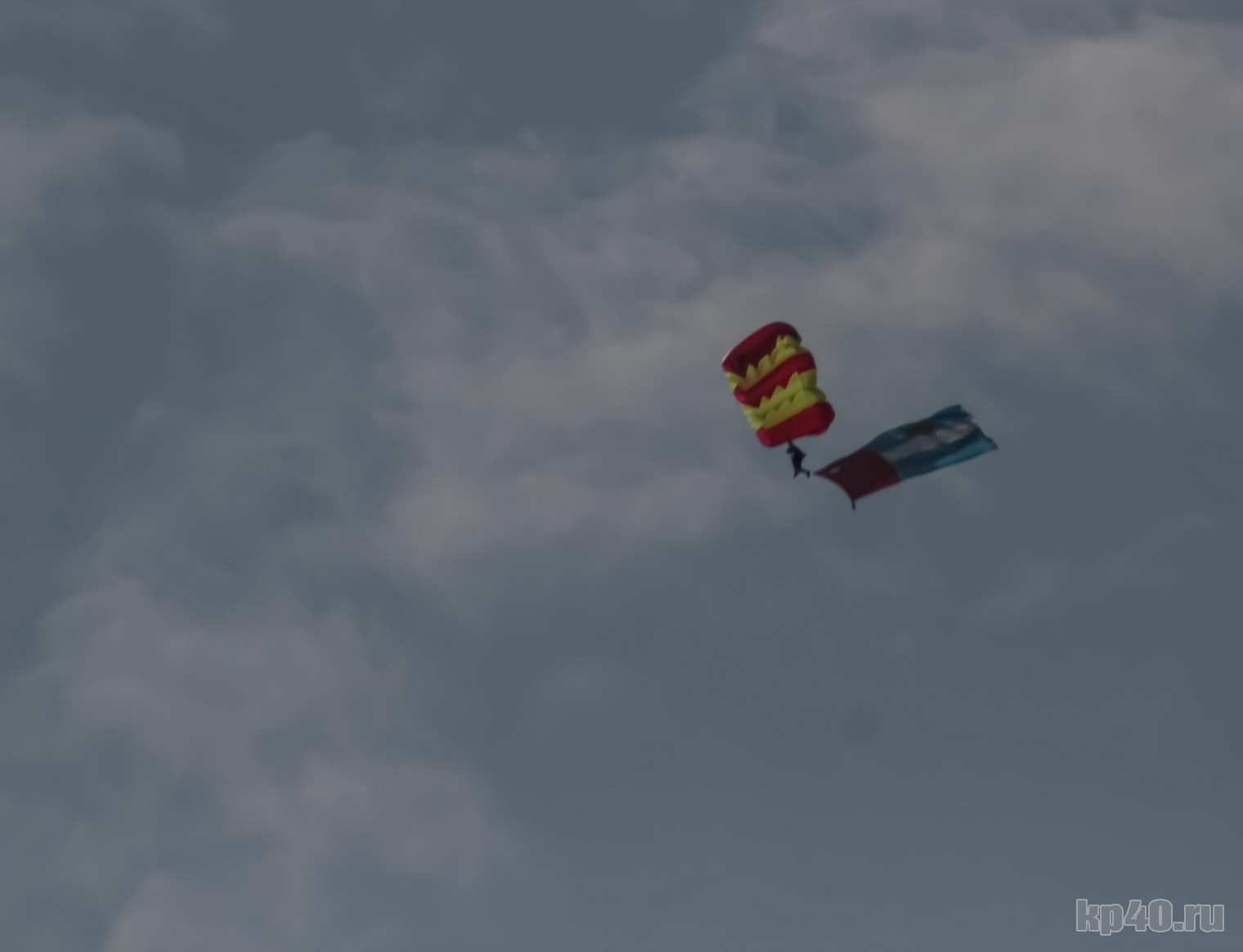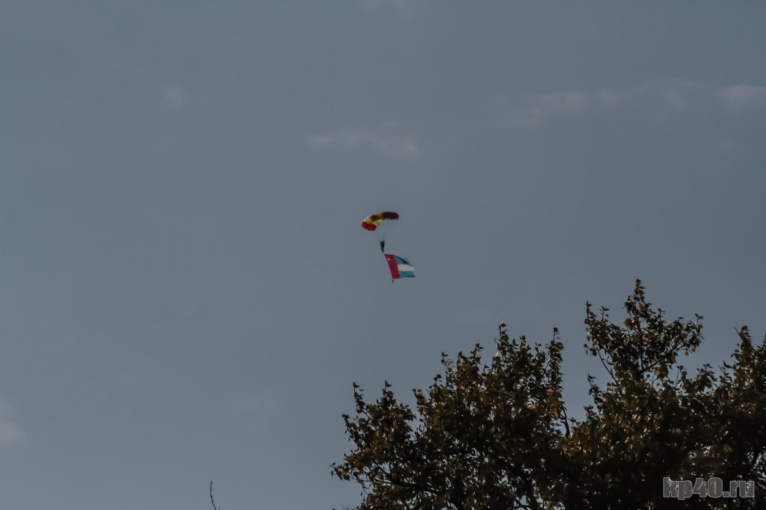 А затем на зеленую зону у сквера Волкова с флагами России, Калуги и Калужской области приземлились парашютисты.