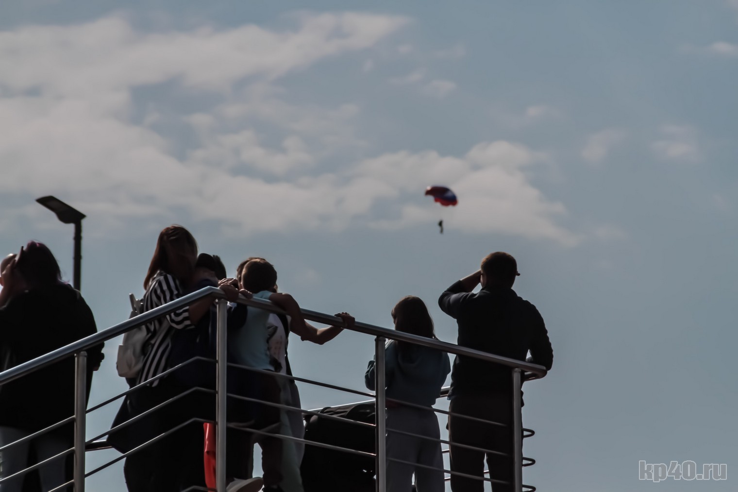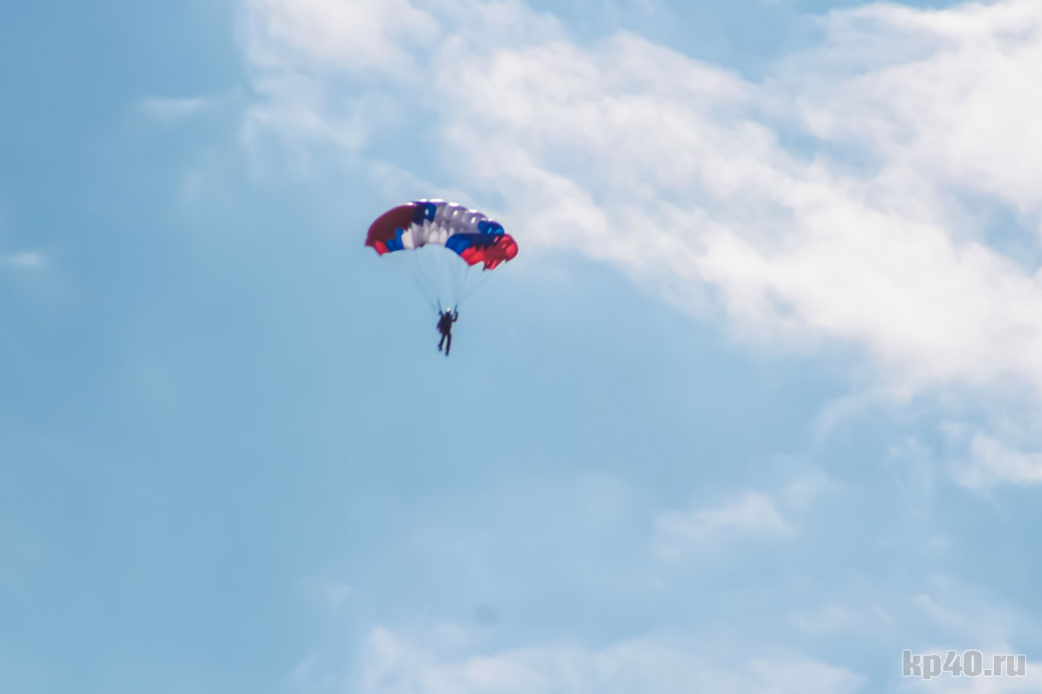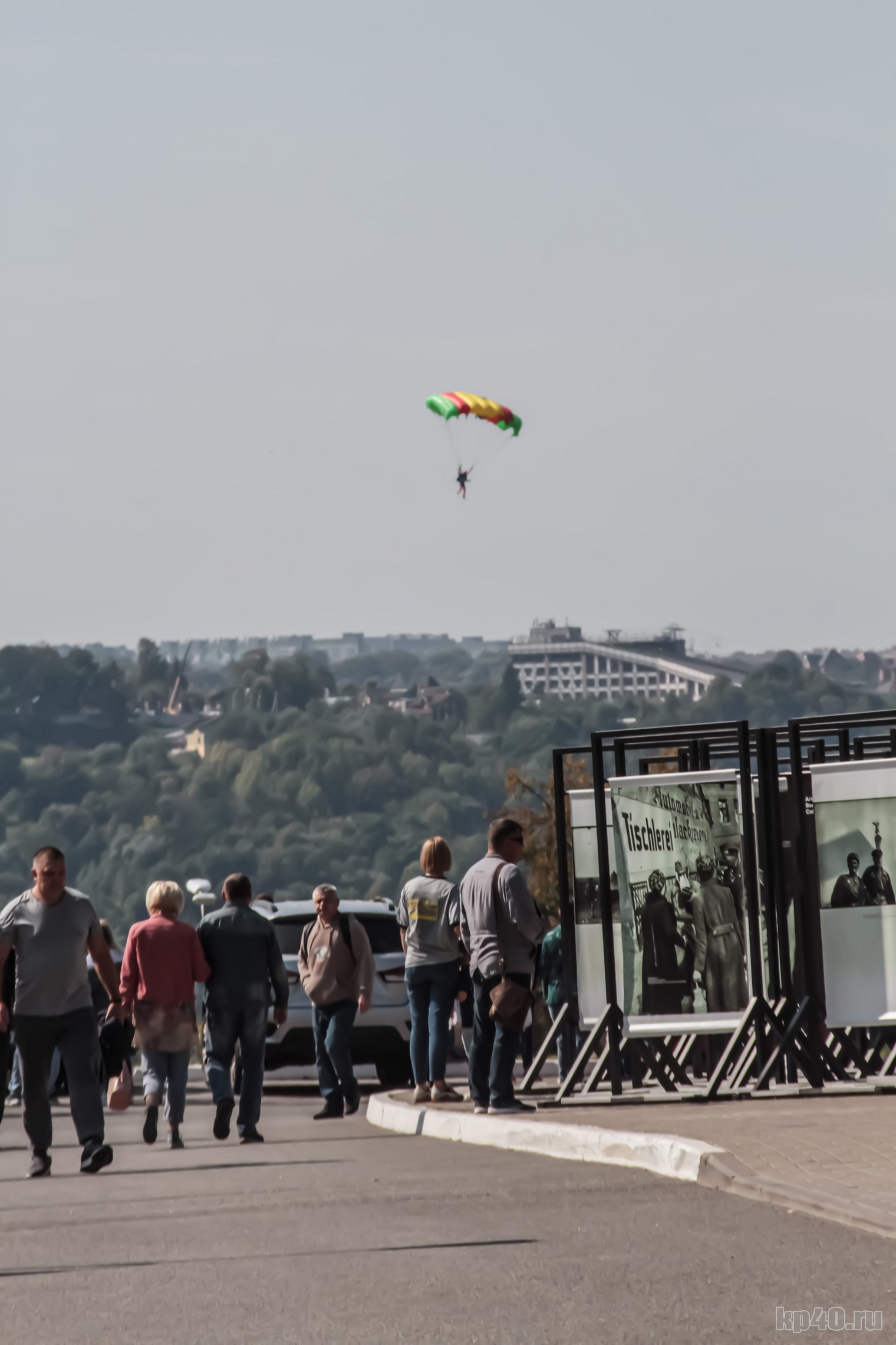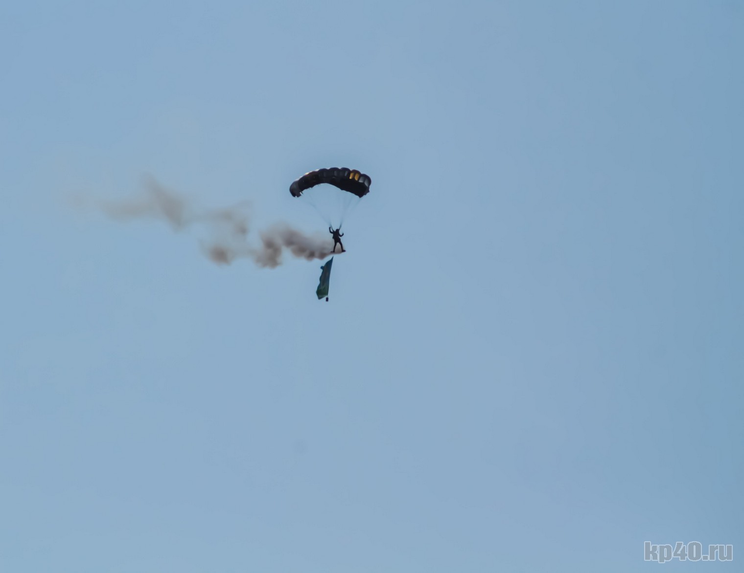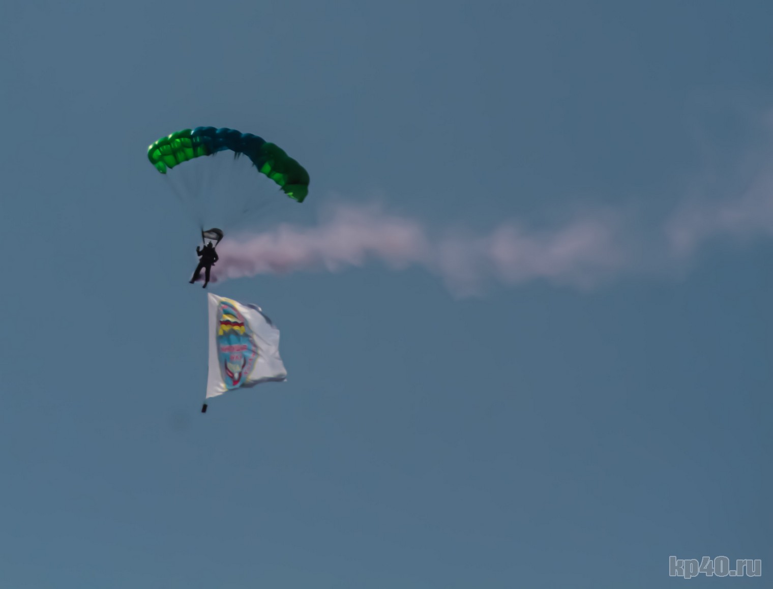 А затем на зеленую зону у сквера Волкова с флагами России, Калуги и Калужской области приземлились парашютисты.