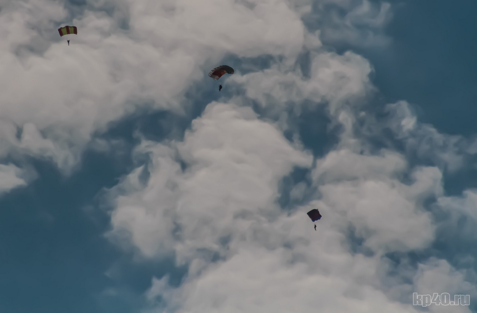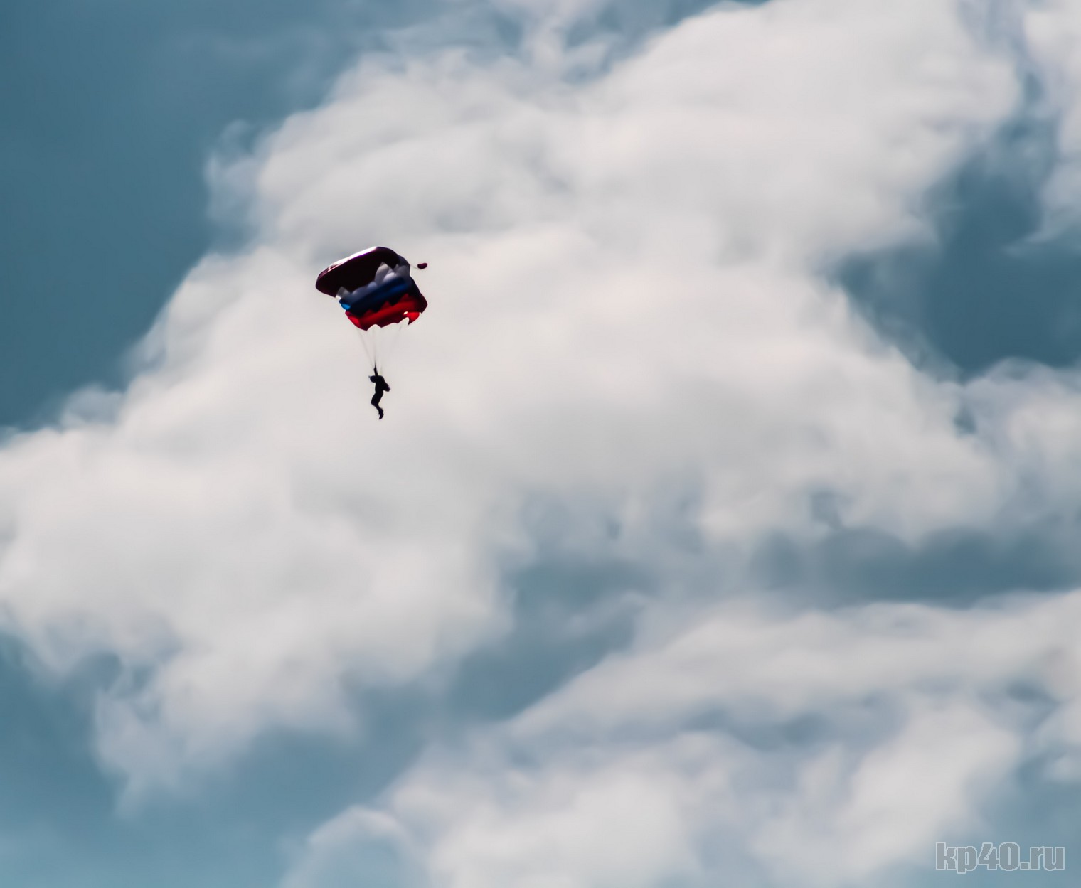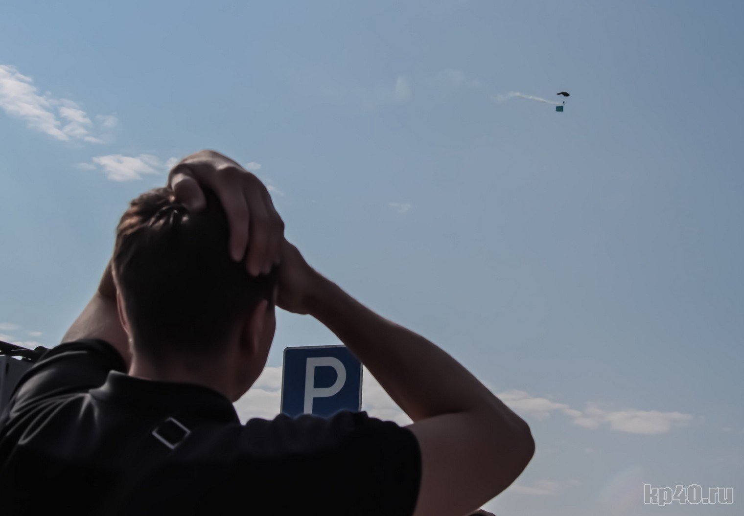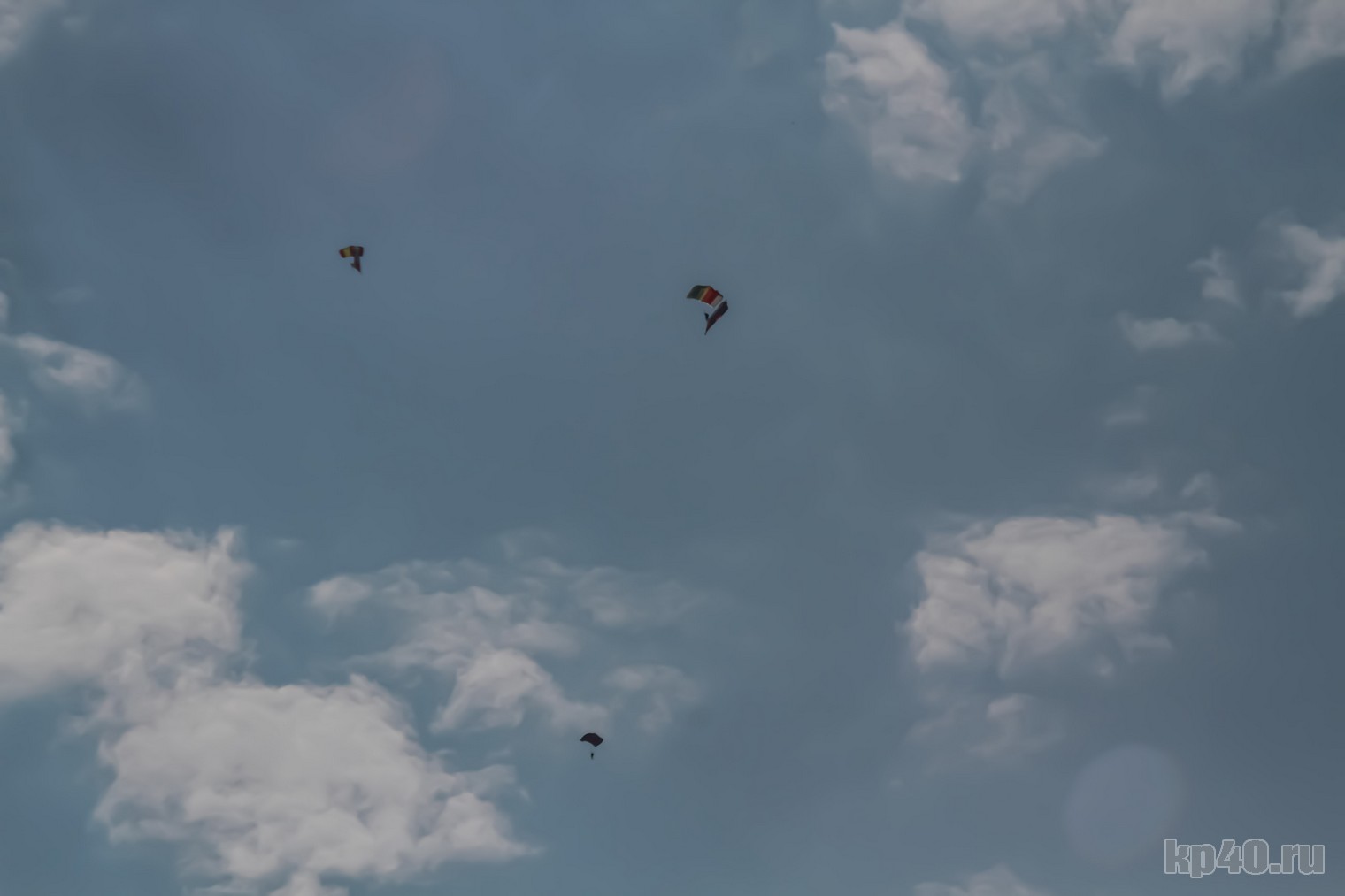 А затем на зеленую зону у сквера Волкова с флагами России, Калуги и Калужской области приземлились парашютисты.