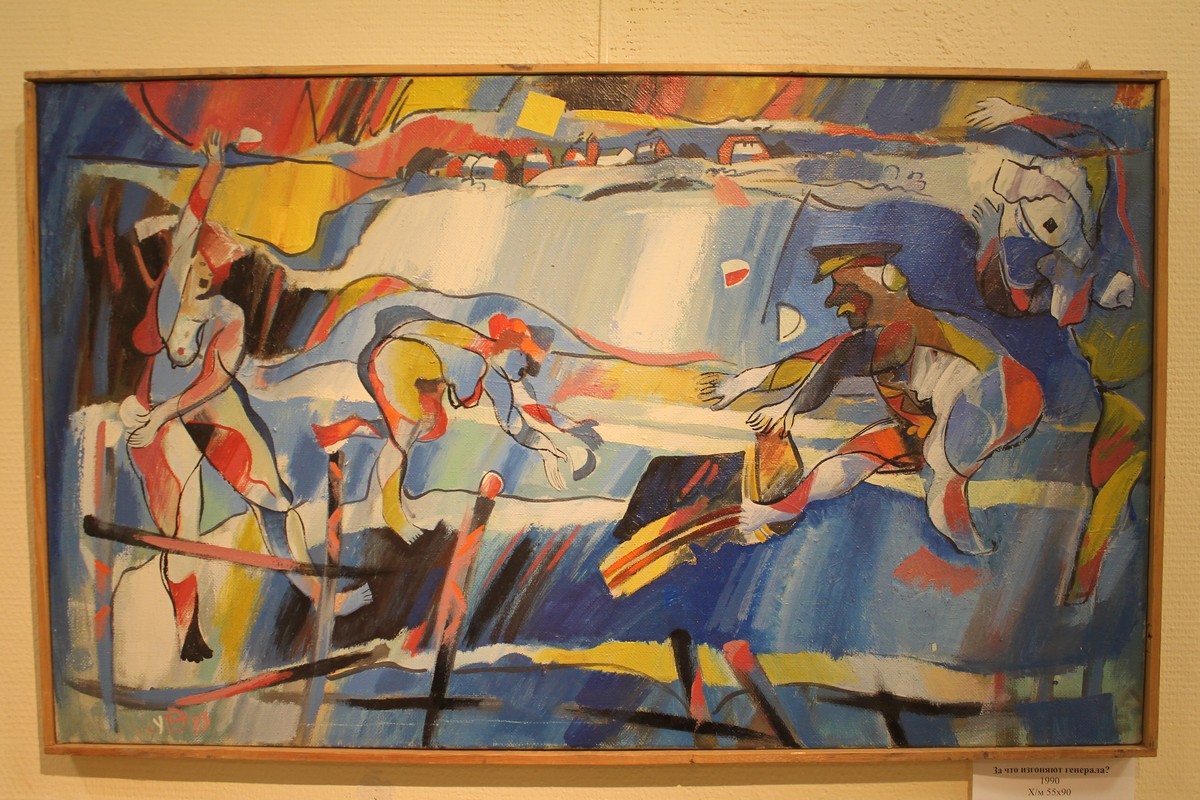 Немцам очень нравится работа «За что женщины изгоняют генерала». Все это дело в бане происходит. Я изобразил, как женщины в него снежками кидают. А он одевает генеральские штаны. Написано это на фоне объединения Германии. В ГДР тогда было 300 генералов, их всех уволили в отставку. Такая для многих трагедия была. Один человек подошёл ко мне, говорит: «Чего вы так не любите генералов? У меня родственник - генерал даже запил на нервной почве». А я говорю: «А у меня не пьют, их так выгоняют».