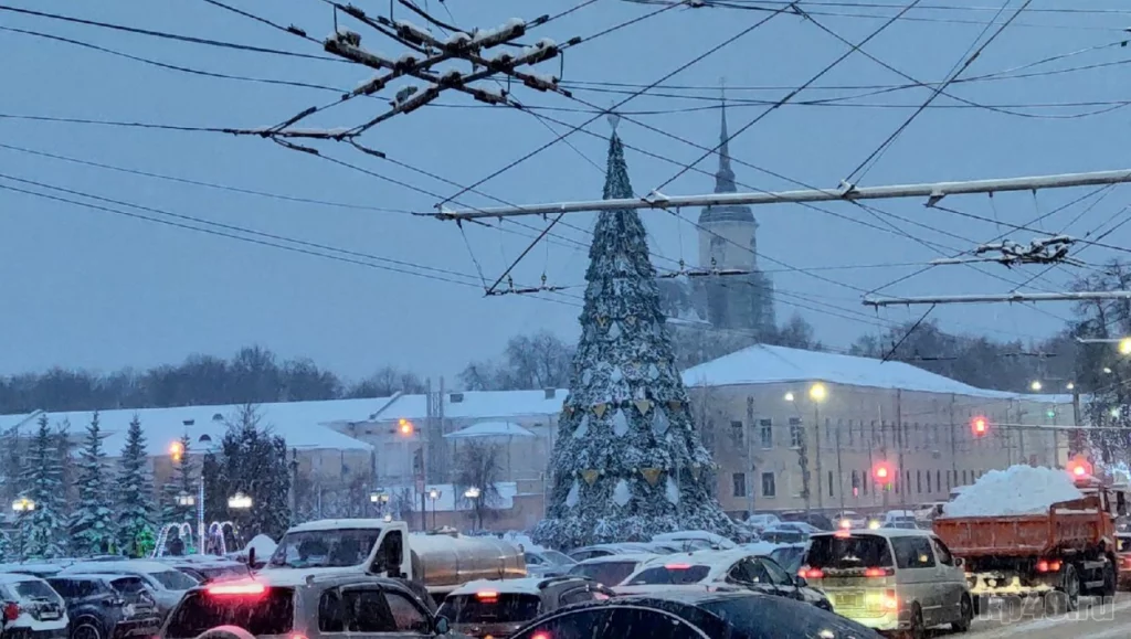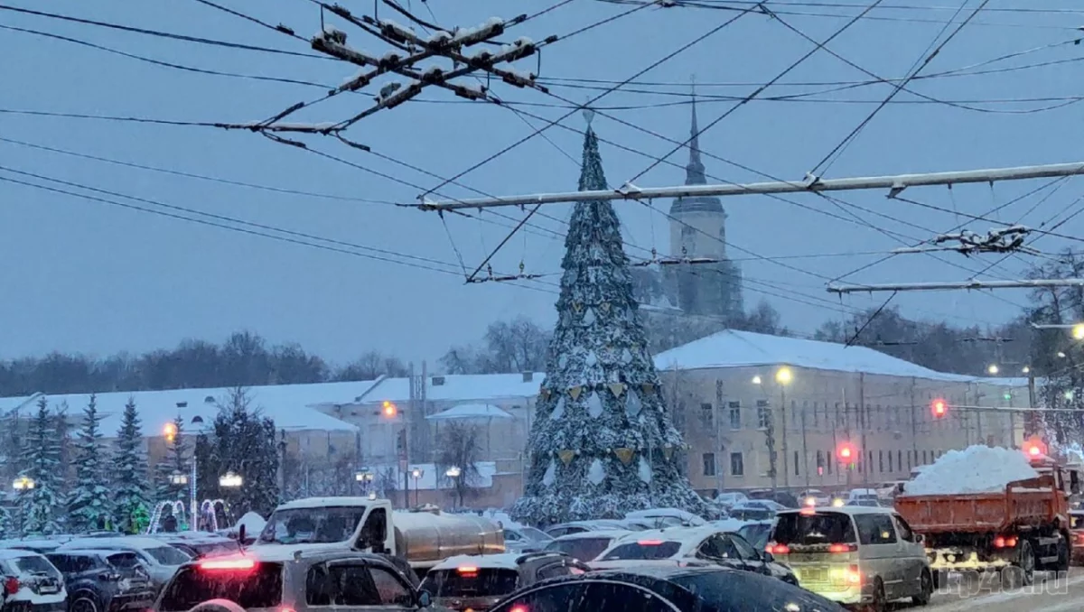 Главная елка Калуги покрылась слоем снега.