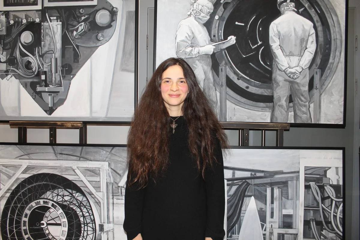 - Серия «Технология» - самая любимая, - признаётся Агне-Мария. - Потому что я много с ней пережила, это была моя дипломная работа в Суриковском институте. Больше года готовилась, чтобы нарисовать. У меня были мешки, килограммы эскизов, я придумывала концепцию. Работа посвящена предприятию, которое находит в Калужской области и делает всё: от композитных материалов до деталей марсоходов. Удивительное место! Поражает, что оно находится настолько близко к нам. Серия нарисована не в случайном порядке. Здесь есть ритмическая задумка: круглые формы сочетаются с острыми. И это не точно переданный чертеж, а художественный образ. Если сюда придет человек, который в этом разбирается, он будет меня очень ругать. И лучше смотреть на работу с противоположной стены, чтобы видеть всю серию сразу.