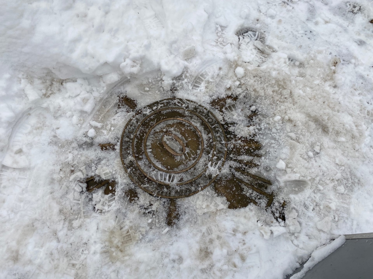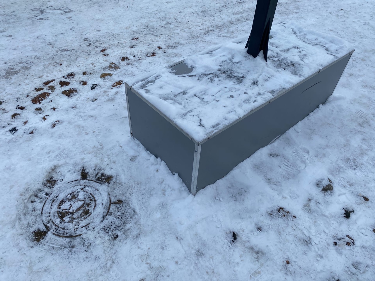 Однако на эту достопримечательность мы обратили внимание потому, что с ней обошлись ну очень несправедливо. Помимо того, что он попросту завален снегом и его пришлось откапывать, прямо на композицию, в которую помимо нулевого километра входит древний булыжник от мостовой, которым когда-то была вымощена улица Театральная, поставили фундамент одной из опор световых гирлянд.