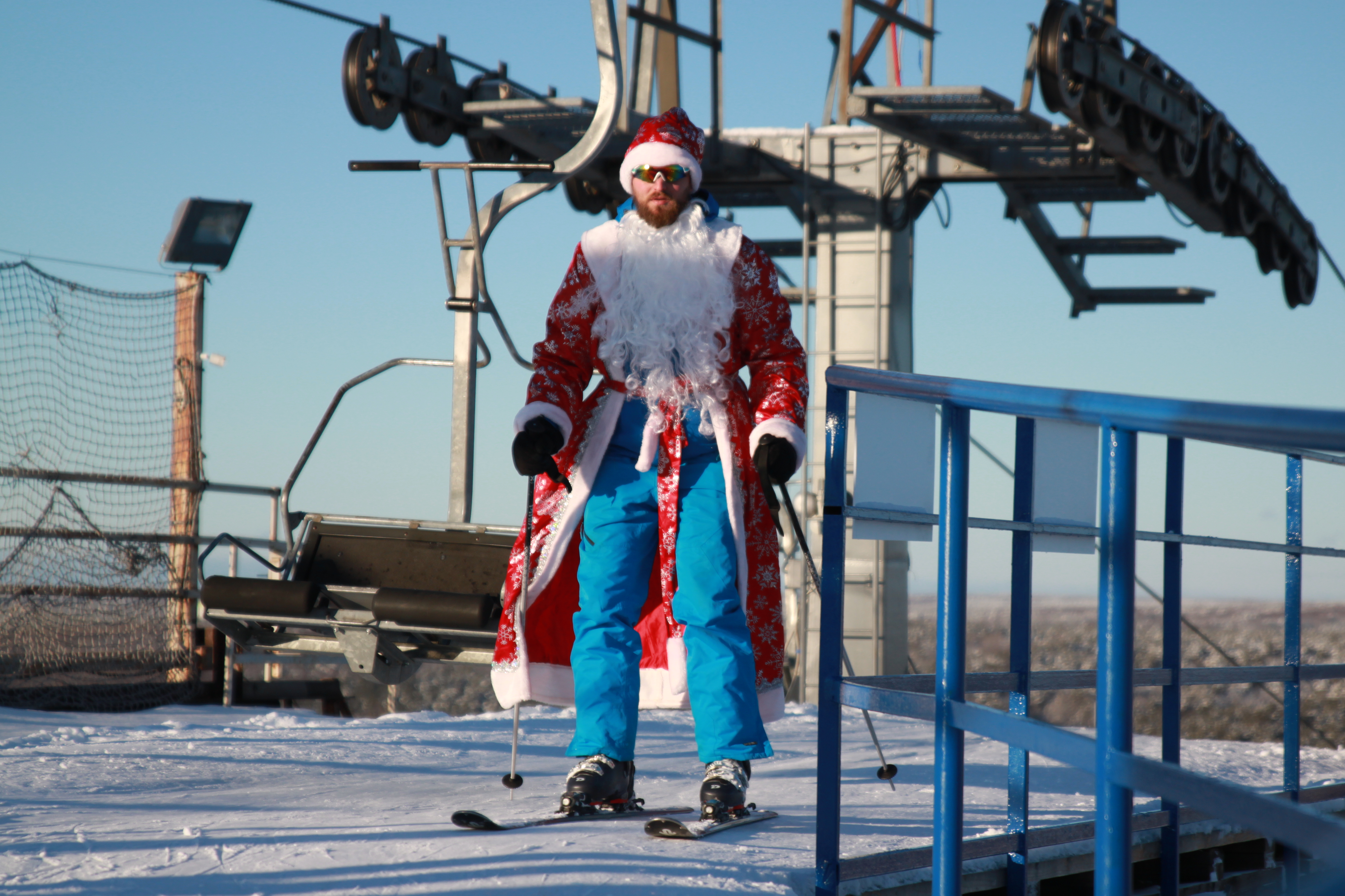 Владимиру через месяц 71 год. На лыжах катается уже 50 лет! Костюм Дедушки Мороза по случайности остался в Малоярославце. Пришлось одеться просто - на стиле!
