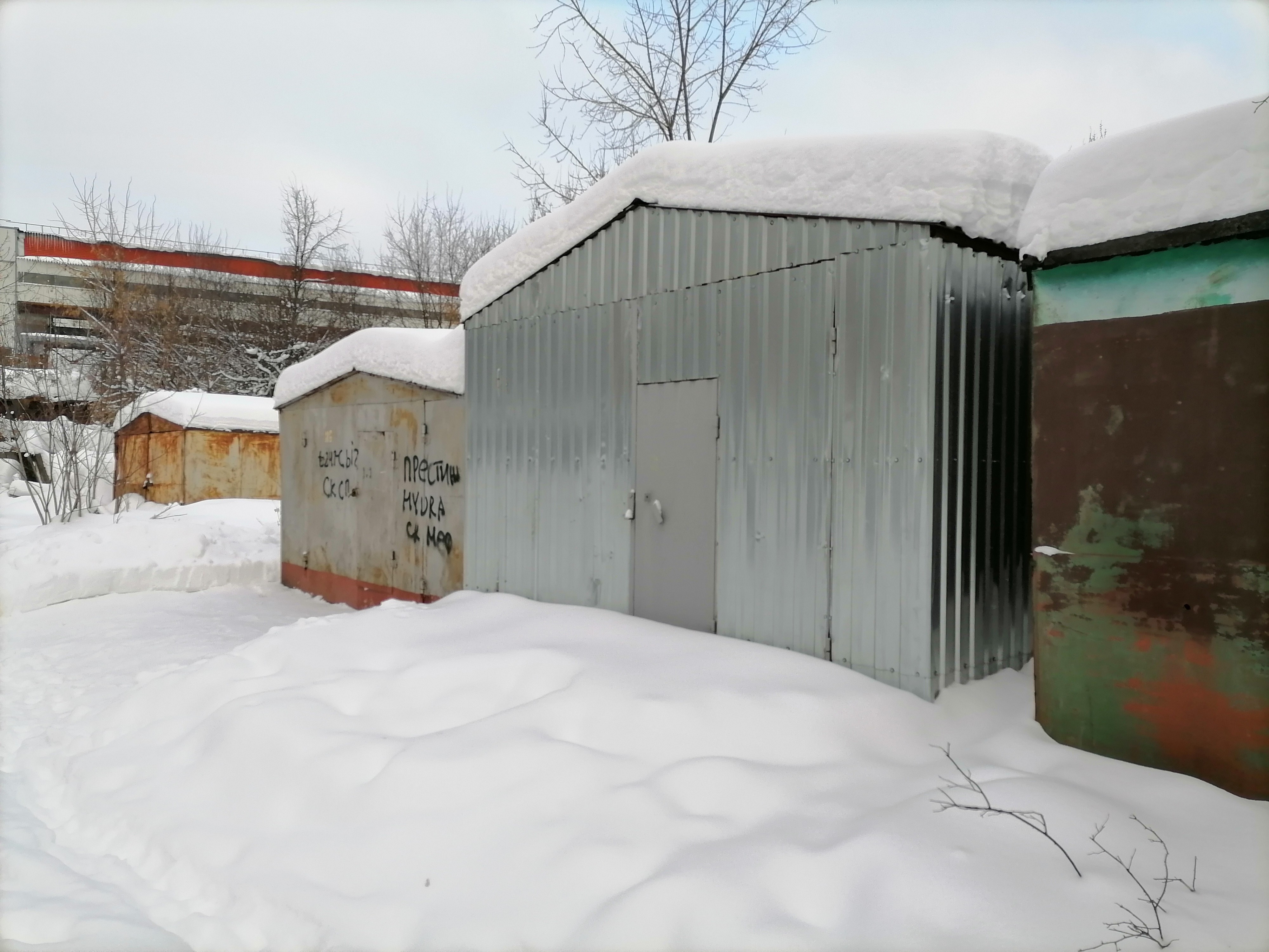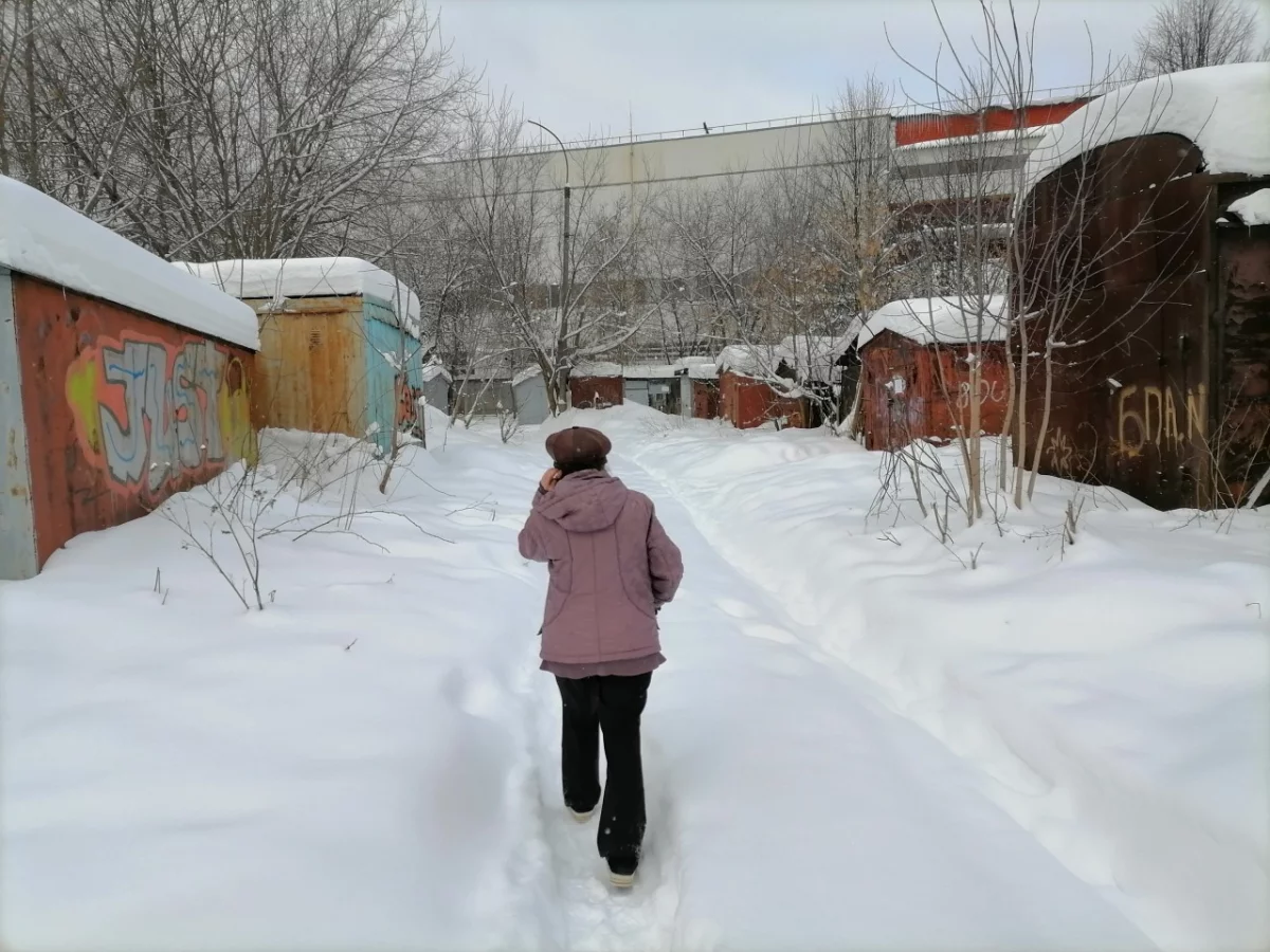 Идем дальше. Я поглядываю, чтобы мой экскурсовод не поскользнулась на колее, оставленной машинами. Пока идем, смотрю по сторонам. Заброшенные и утонувшие в сугробах гаражи чередуются с ухоженными «долгожителями». Дорога расходится, мы поворачиваем вправо.