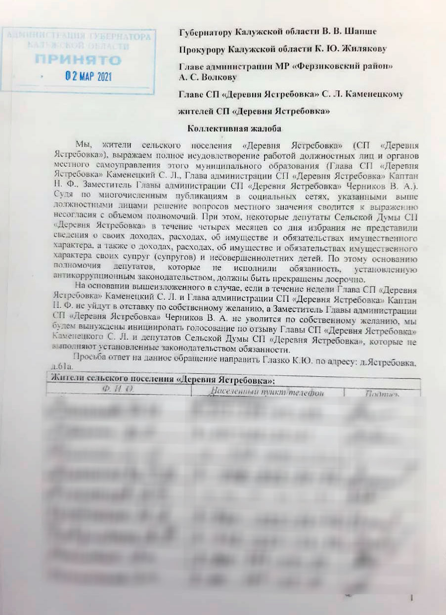 Как мы уже писали, в конце января к нам обратились жители сельского поселения «Ястребовка» под Калугой, которые возмущались отставкой главы Сергея Каменецкого. Он и его сторонники увидели в таком решении депутатов нарушение закона о самоуправлении и посчитали его нелегитимным.