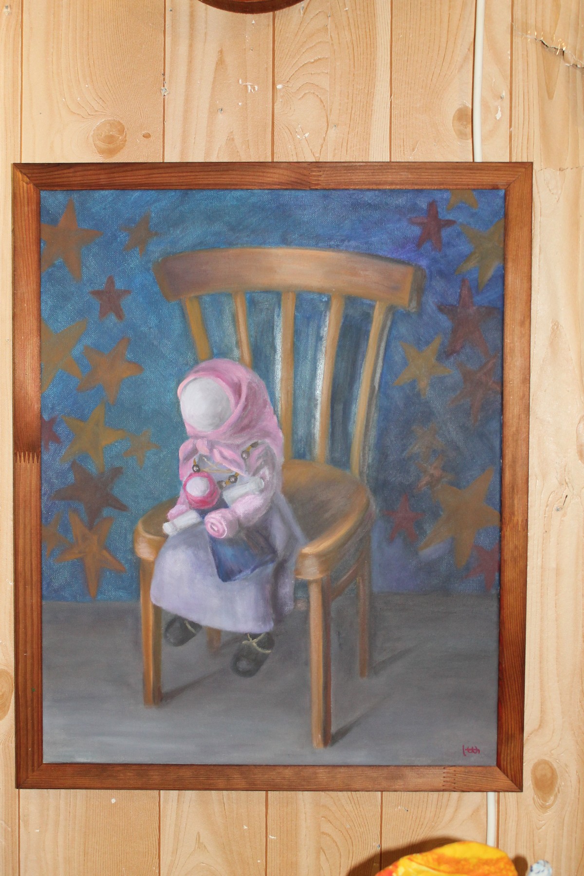 - На картине я её изобразила на стульчике, она сидит, ждёт хозяйку. И чтобы ей не одиноко было сидеть, в компанию ей тоже нужно было куколку дать.